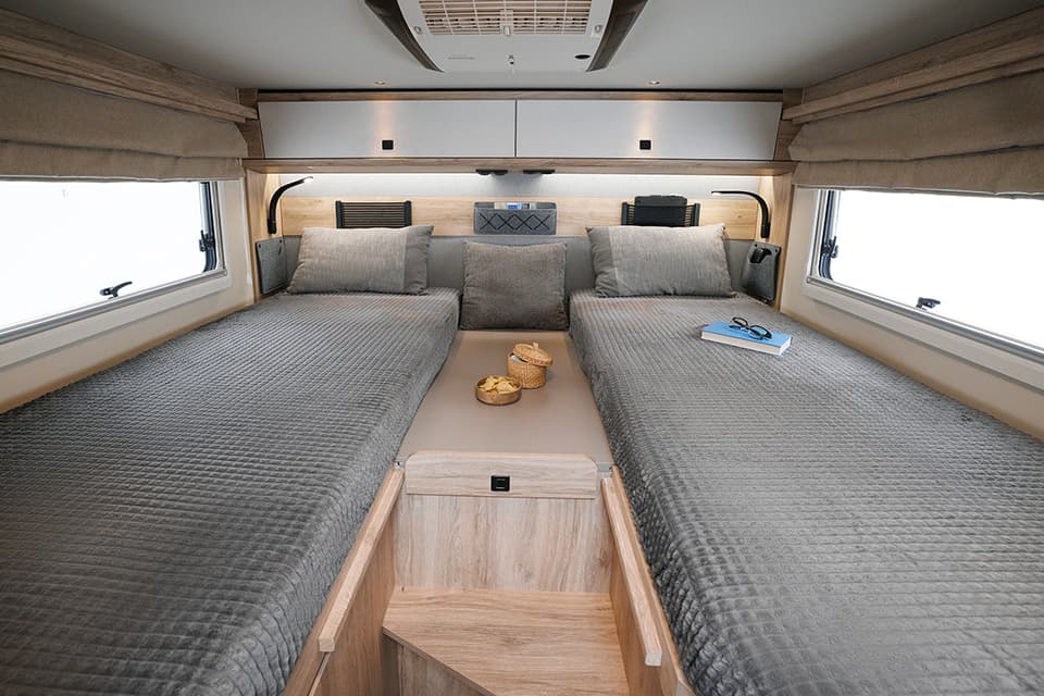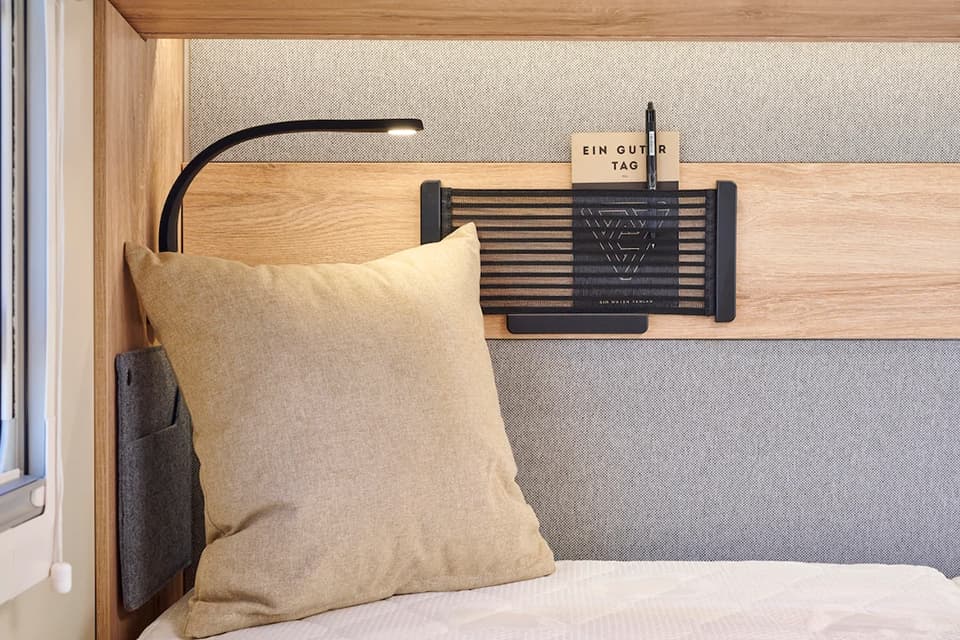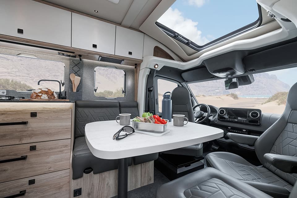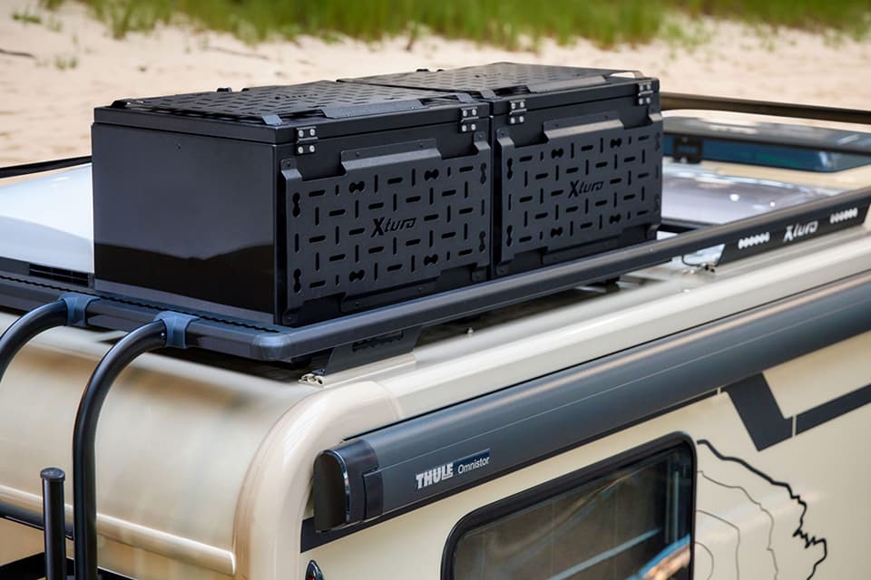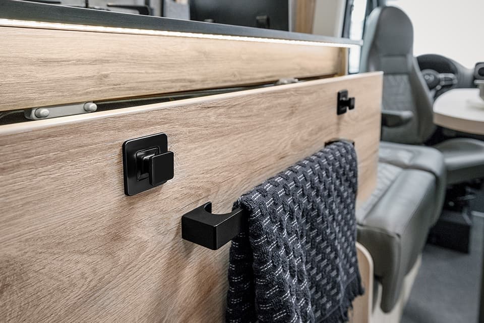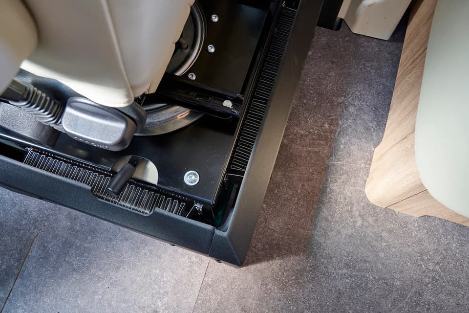 Various modular transport boxes or similar can also be securely attached to the roof. Eura Mobil has also focussed even more on the rough requirements off the beaten track in the details for the 2024 season. For example, the kitchen pull-outs have been secured with double locks. Underfloor heating can also be installed in the cab as an option.