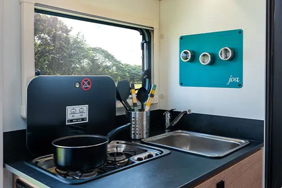 The user-friendly kitchen has everything you need: worktop, 2-hob stove top, waste bin, large pot drawers, and a 133-litre fridge with a freezer compartment. A storage space rounds out the overhead cupboards. A Joa magnetic board holds your holiday snaps, mini herbs and that new local recipe you want to try.