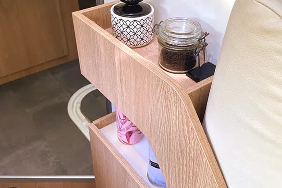 Four people can fit in the wide lounge, where everything has been designed for you to enjoy chatting, playing and dining in comfort. The table top slides to adjust its position or free up walking space. Plenty of storage is accessible. At night, the soft, energy-saving LED lighting adds charm to your discussions.