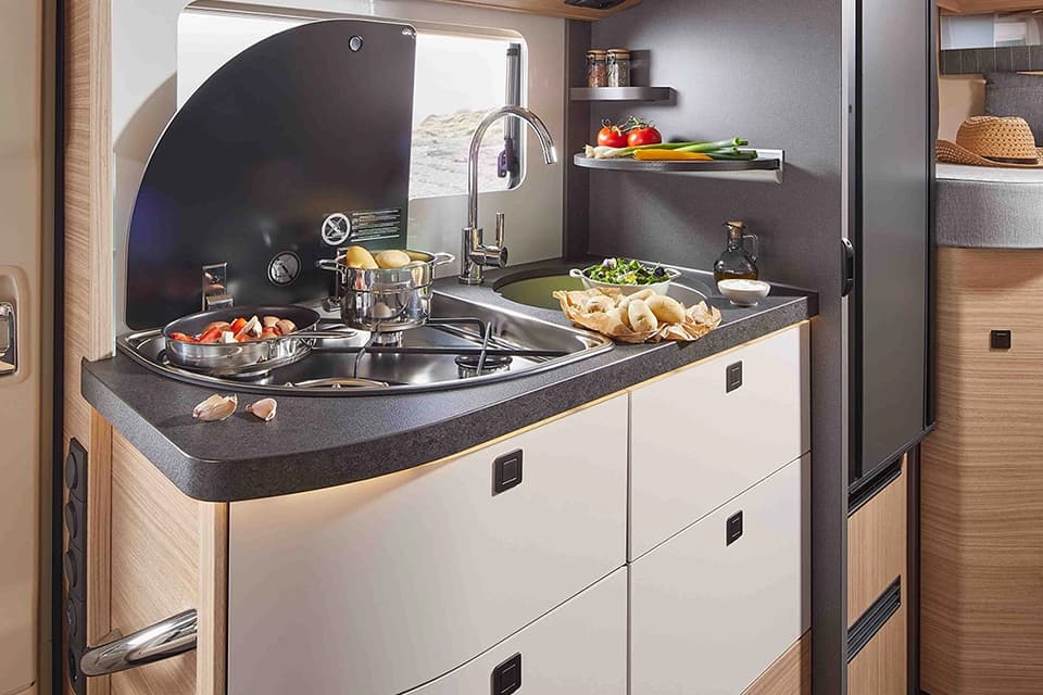 And thanks to the LED lighting, you will always be able to see all of your luggage. The numerous large exterior hatches ensure that it is easy to load the vehicle from outside, while the large, self-supporting floor hatches in the living and kitchen area of the motorhome provide convenient access to the extra-deep, recessed storage compartments from the inside. The double floor storage space also acts as a heat store to protect your cargo from frost, which is handy when it gets colder.