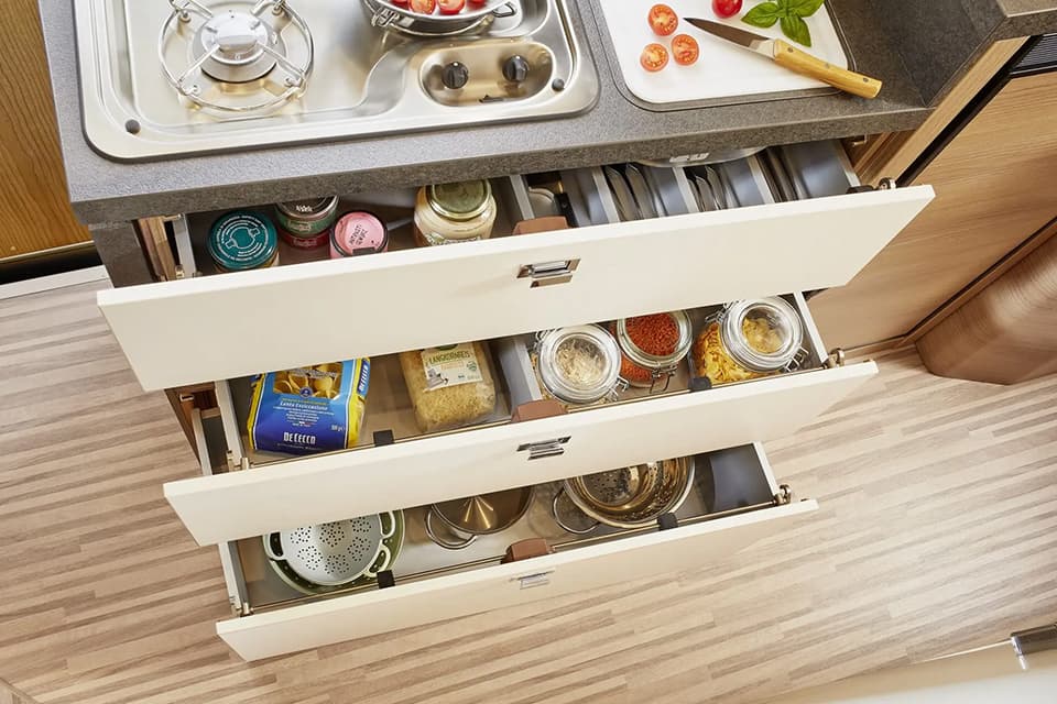 Are you looking for a camper van with a large kitchen and lots of open space? Then the Malibu Van diversity is the perfect choice for you. Our versatile camper van has a spacious feel with an open line of sight and an XL comfort kitchen with high-performance 84-litre compressor fridge in a separate, universal combination cabinet, extra-large worktops and shelf spaces, as well as extra-wide and extra-deep kitchen drawers.