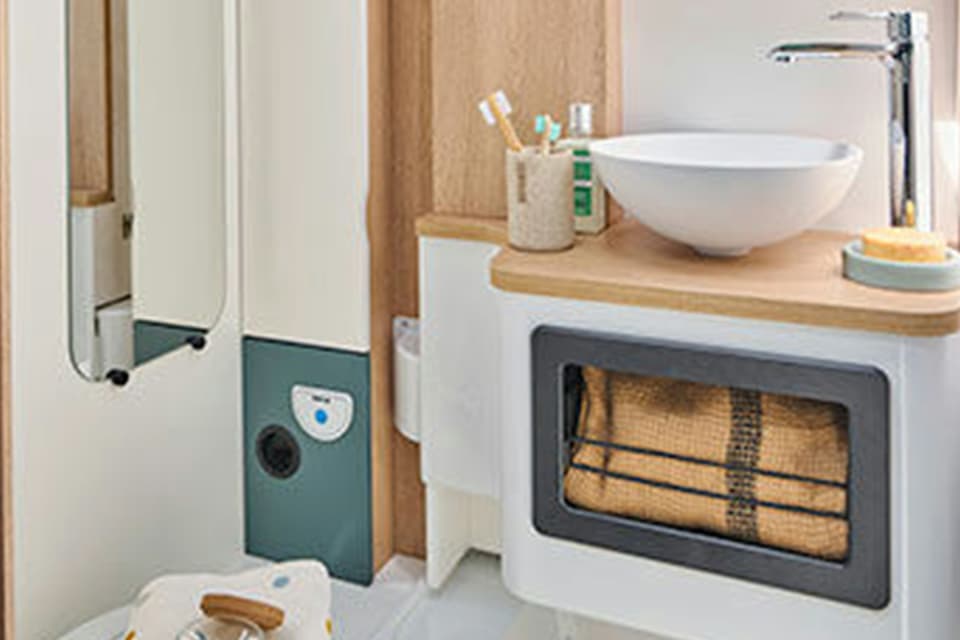 Discover a remarkably well-designed washroom, meticulously crafted to optimize every centimeter. Its key feature lies in its 2-in-1 modularity, made possible by a clever removable partition. In an instant, you can transform the space dedicated to the toilet and sink into a comfortable and spacious shower. This intelligent design maximizes space utilization, offering you both the functionality of a complete washroom and the comfort of a true shower, all within a compact format. It's the ideal solution for combining practicality and well-being on your travels.