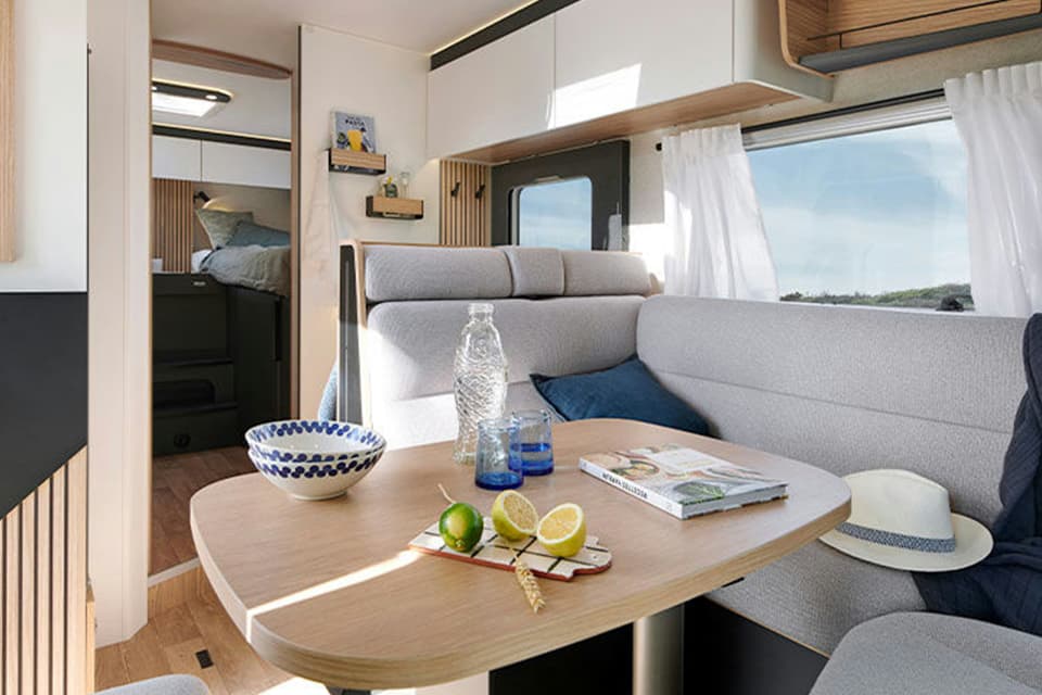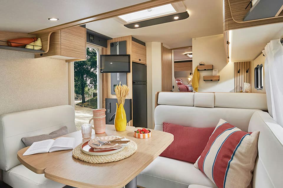 This all-in-one has excellent circulation from the living room to the bedroom and a real day/night partition. The living room has 5 seats for meals. It has two L- shaped bench seats and a modular table that makes it easy to move around. Its large windows and panoramic skylight make it a pleasant, bright living space.