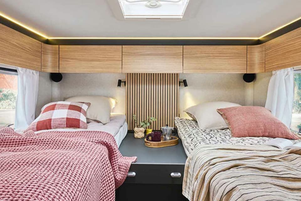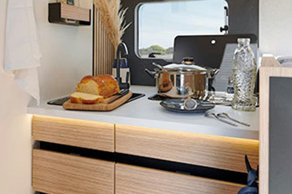 Beautiful, well-equipped kitchen on the right with a 2-burner hob, a compression refrigerator, comfortable work surface, numerous drawers and storage units, 230V, 12V and double USB sockets, large bay window and skylight opening to let in plenty of light.