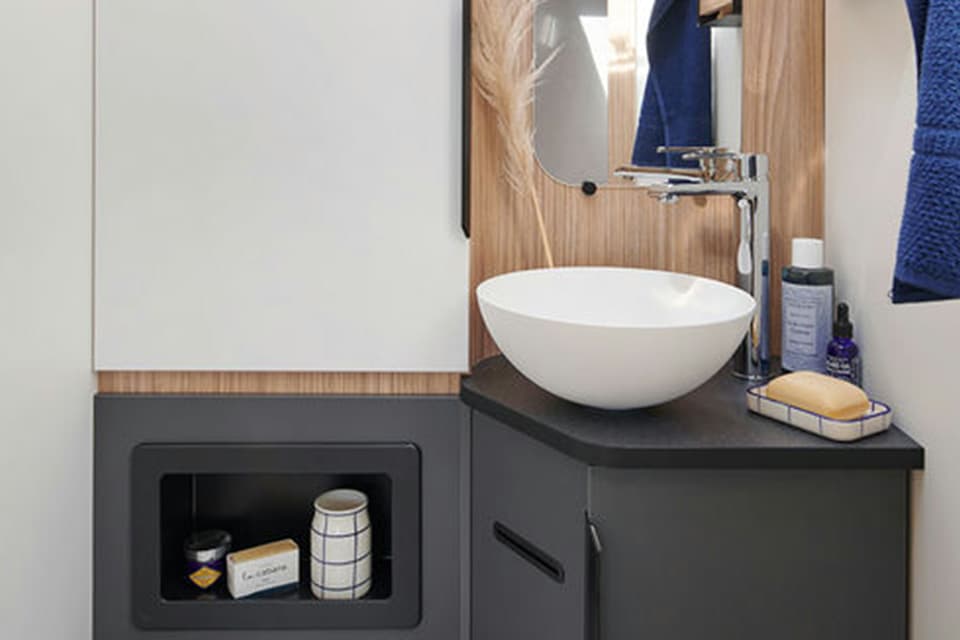 Stylish and compact (6.99 m), the G690GJ is a perfect compromise. Each space is optimised to combine style and practicality. This A-Class offers ease of movement between the lounge and bedroom, which are entirely separate spaces.