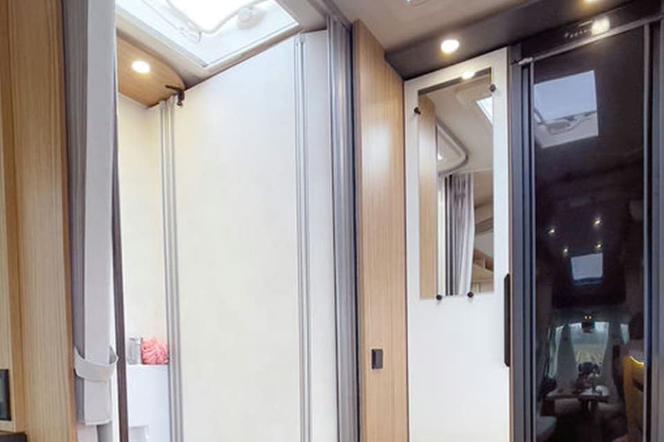 Cleverly-designed, bright bathroom with a skylight. This space has been designed to give you maximum comfort in the bathroom without sacrificing any space in the other living areas. When you step inside, you only see the basin, large mirror and toilet. Hidden away behind the partition is, in fact, a shower. To have a shower, simply pivot the partition to open up the shower space. Pull the curtain back to discover yet another new storage space.