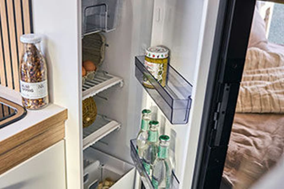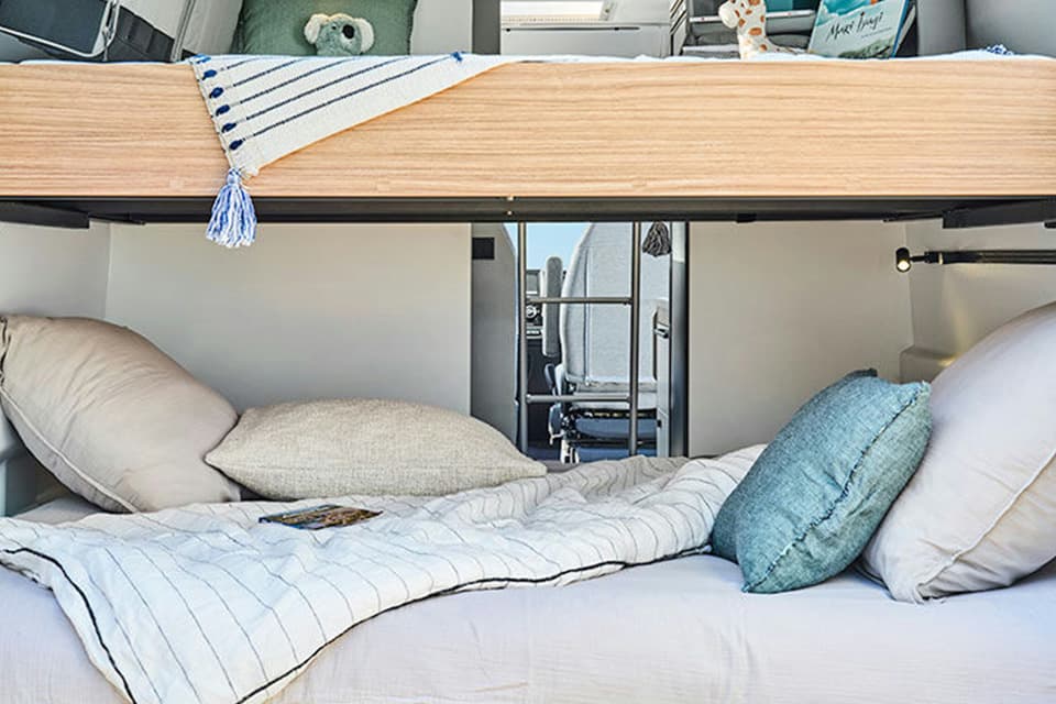 At the rear, the bedroom stands out for its high modularity. The bunk beds can be configured to suit your needs: as twin beds, a double bed, or a single bed with generous storage space underneath. The upper bed, equipped with a slatted bed base and independent mattress, can comfortably accommodate one or two people. An ideal setup for families or travelers seeking flexibility and comfort.