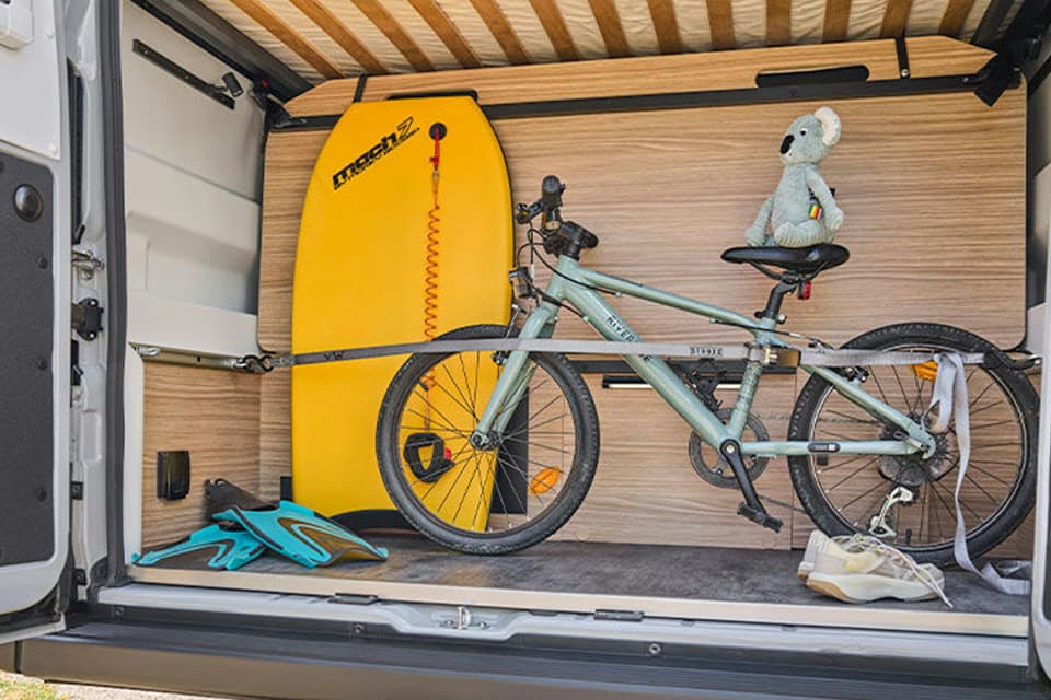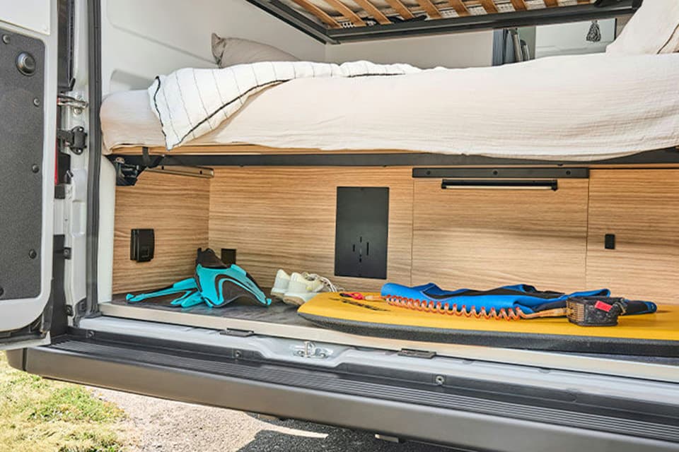 The 2026 new model from Pilote, the V630S, is a modular and innovative family panel van. It features convertible bunk beds and an adjustable upper bed to suit all travel configurations. Its removable storage cases replace overhead cabinets, offering practical and quick storage. The through-loading garage space accommodates bikes and bulky equipment with securing rings. The fully opening bathroom ensures comfort and space, even in the great outdoors. The V630S combines modularity, comfort, and functionality for adventures without compromise.