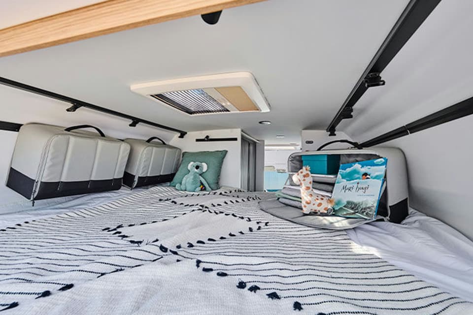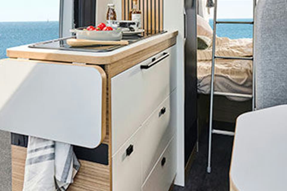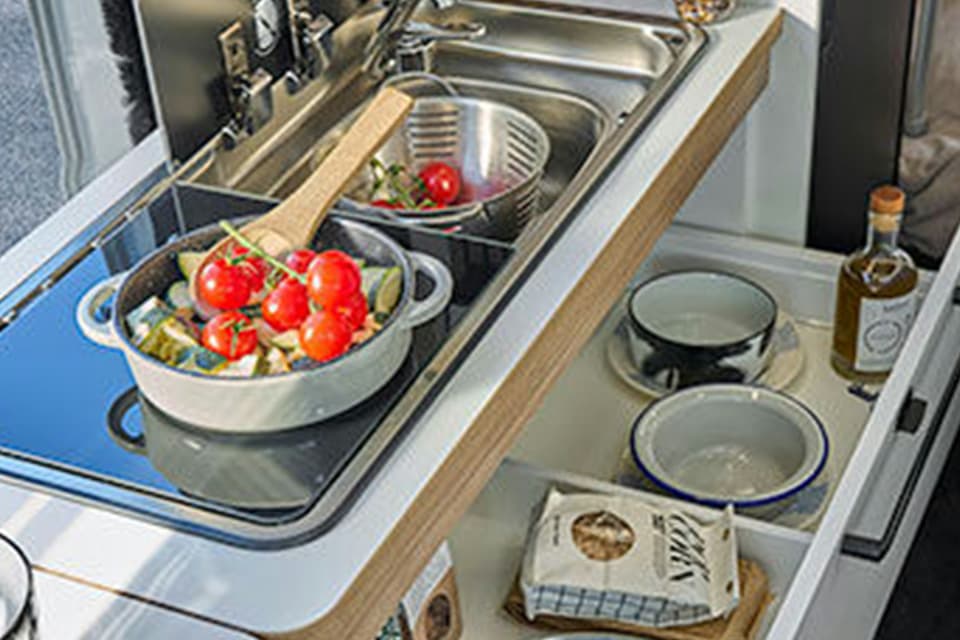 The V630S has been designed to offer maximum flexibility for all types of travellers, with particular attention paid to the sleeping area. Thanks to its clever system of modular bunk beds, it can be quickly adapted to suit the needs of families, couples, or solo travellers. Double bed, twin beds, single bed with large storage space, or retractable upper bed – each configuration allows for optimal space use without compromising comfort. At 6.36 m in length, with smart interior layout and high modularity, the V630S is the ideal travel companion for those seeking freedom without sacrificing practicality.