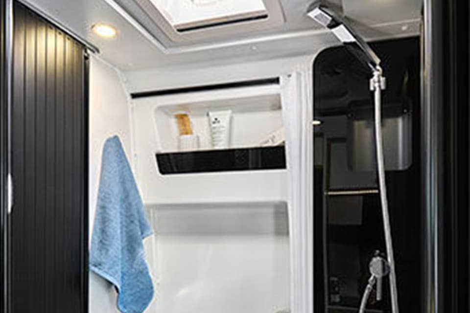 The shower room is walk-through and has double partitioning to provide 3 independent living areas. The skylight provides light and ventilation. And because it's always practical, the shower room is equipped with an optional clothes hook and towel rail.