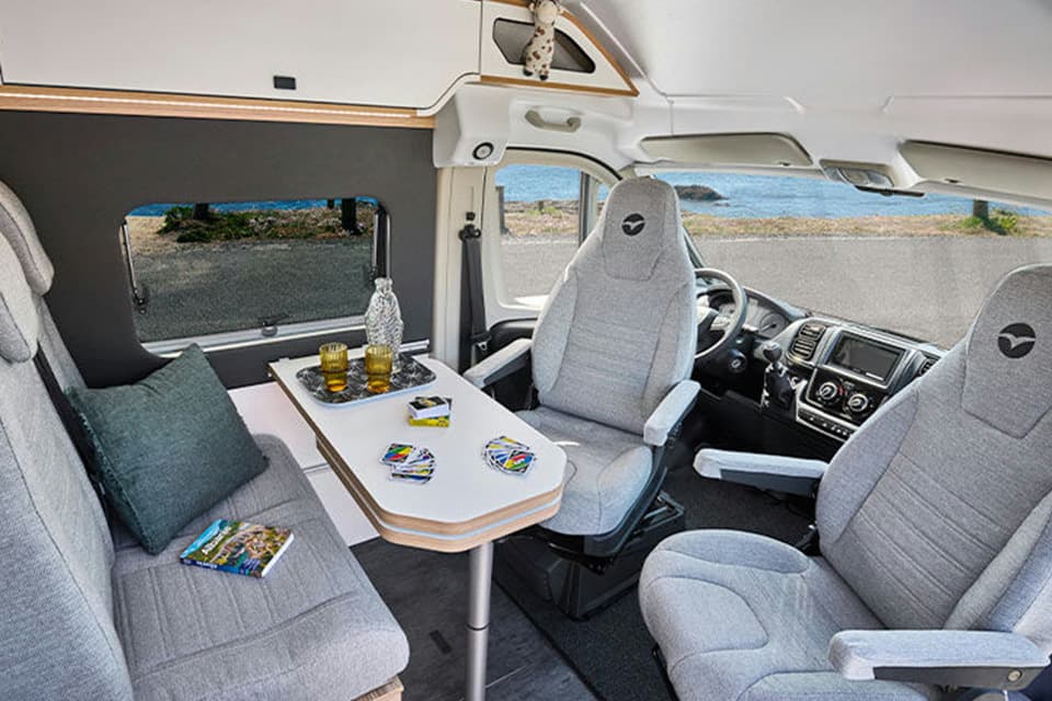 The V630S offers a welcoming, well-designed lounge area, where the swivel cab seats and forward-facing bench create a pleasant space for sharing meals or relaxing with up to four people. The adjustable table adapts to different times of the day, and the large windows provide abundant natural light, enhancing the feeling of space.