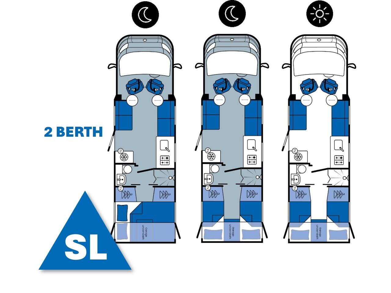 The 2026 ACE lineup features a Fiat Ducato panel van available in 3 layouts, each with an optional pop-top, and coachbuilt motorhome, built on a Ford Transit chassis with four 2-berth layouts, two of which can be upgraded to 4-berth.