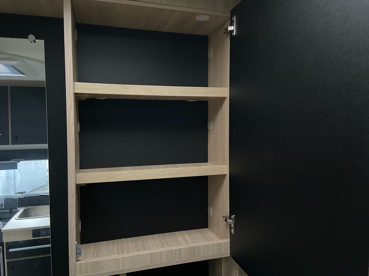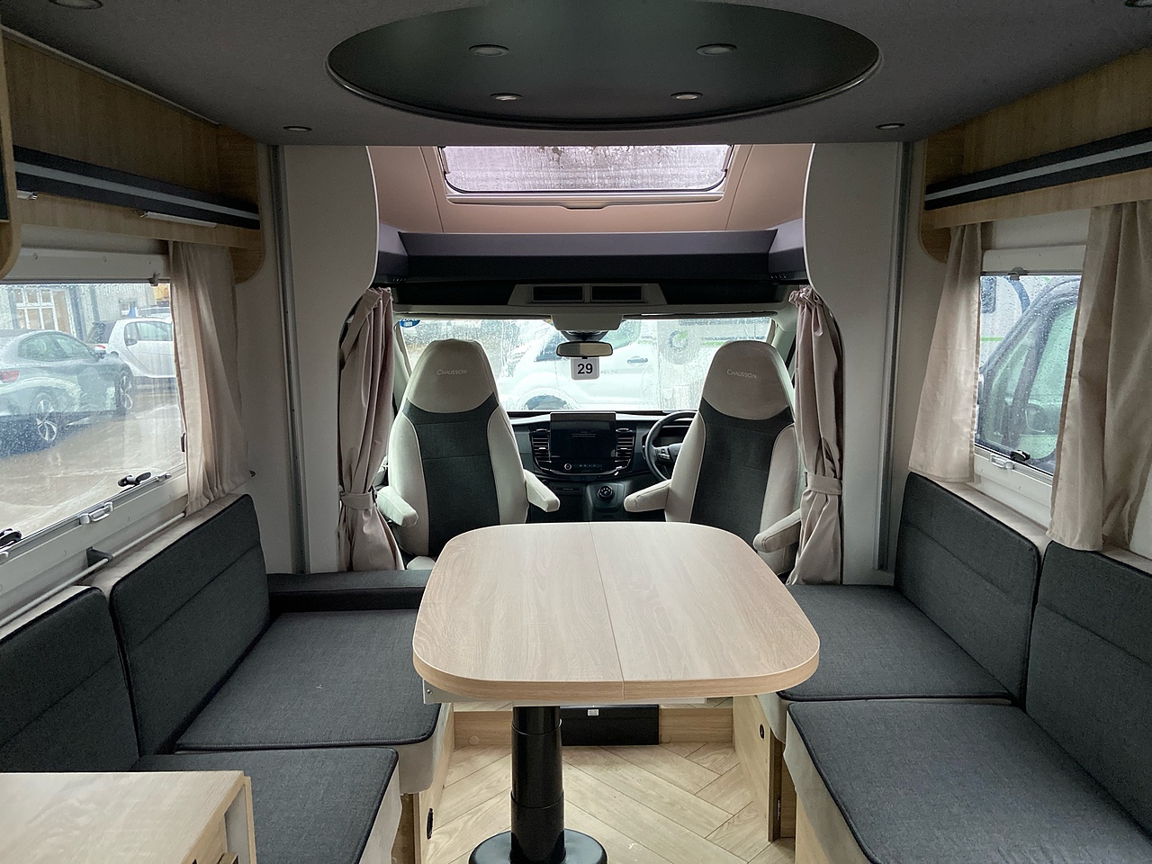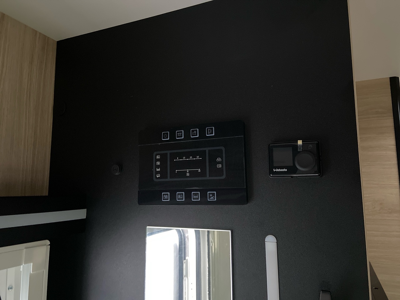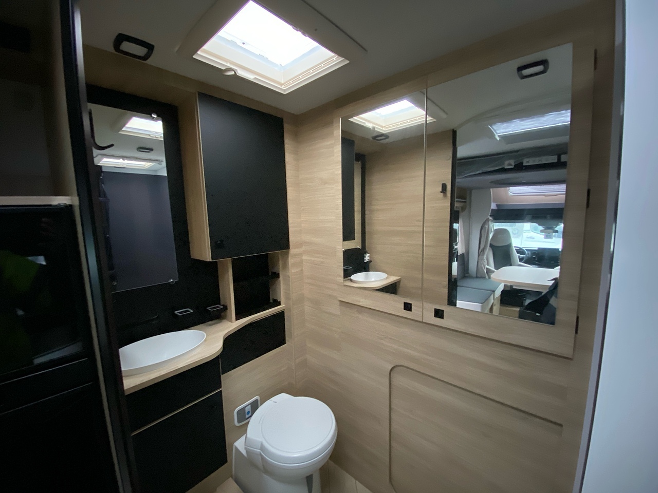 Manual cab air conditioning, Driver and passenger airbag, Electric handbrake, Swivel seats in the cab, with double armrests and adjustable height, Cab seat covers with matching cushions, Electric de-icing rearview mirrors, Cruise control and speed limiter, ESP, START & STOP, Unit step insulation, Unit step lighting, Cab panoramic skylight, Panoramic skylight (or two skylights), Double-locking windows with combined blinds/screens, Atmosphere LED lighting on floor, USB ports, External water intake, IRP structure: GRP on roof/floor/sides, floor 64 mm thick, 6-speed automatic gearbox, Coded front bumper, 16" alloy wheels black, Backlit entrance mirror, Wardrobe with drawers, Gas external socket, External shower, Automatically lighted headlights and windshield wipers, Fog lamps, Luxury entrance door with window and central locking cab/cell, Premium mattress main berth, Wooden shower duck board, TV-ready, Wardrobe, Solar panel, Heating using vehicle fuel digitally programmed and used while on the road, Rear camera, Oven, TV bracket.