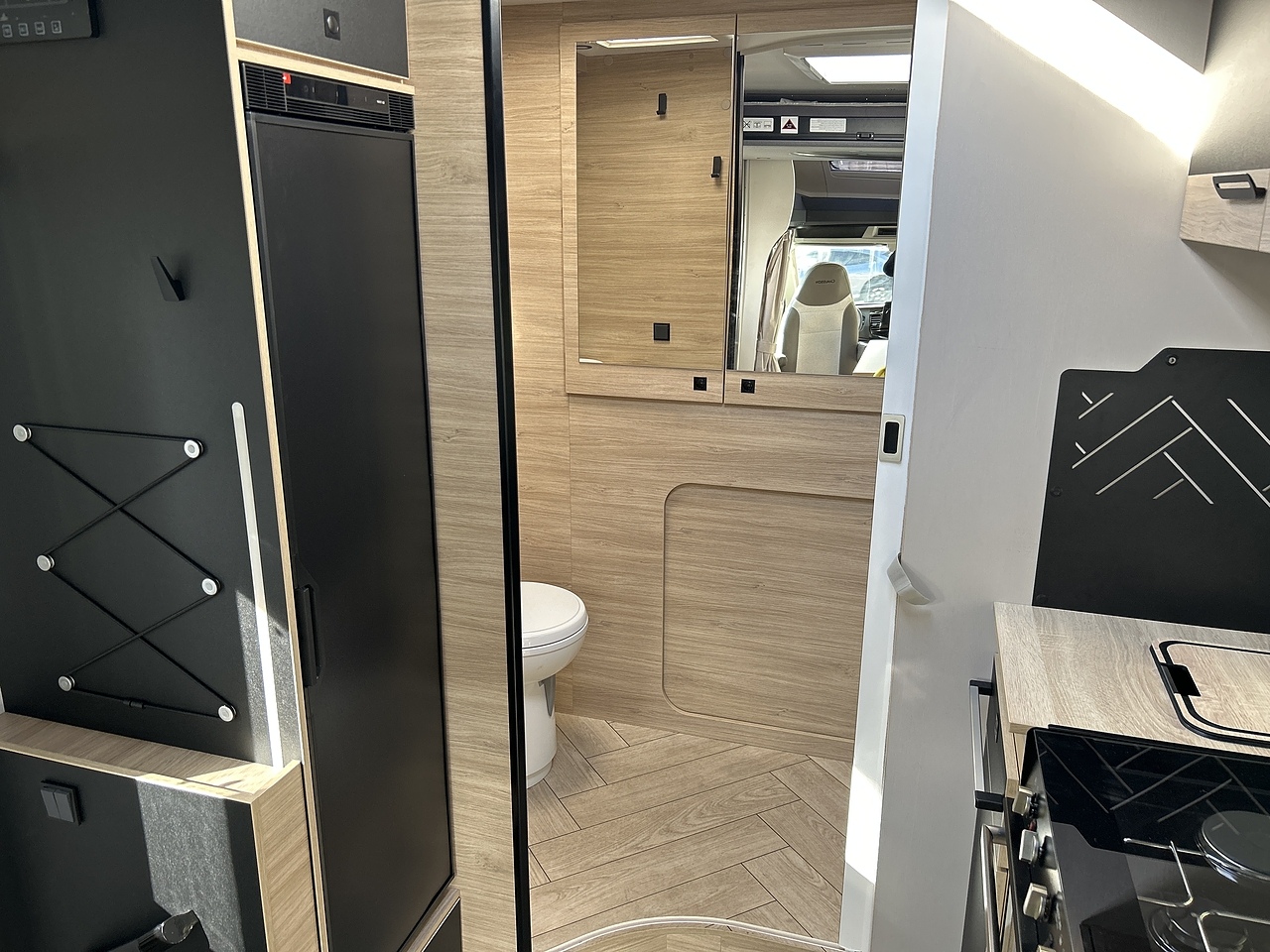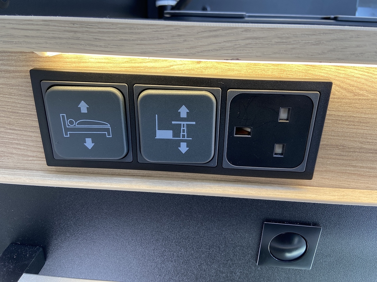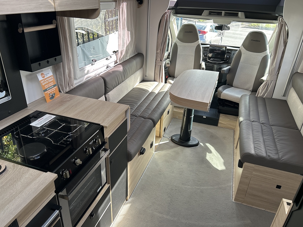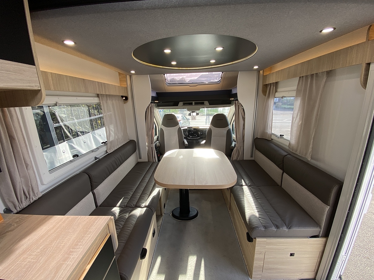 Sleeping: Accommodates up to four people with a large electric drop-down bed above the lounge and concealed traveling seats with a loungue that converts to a double bed.