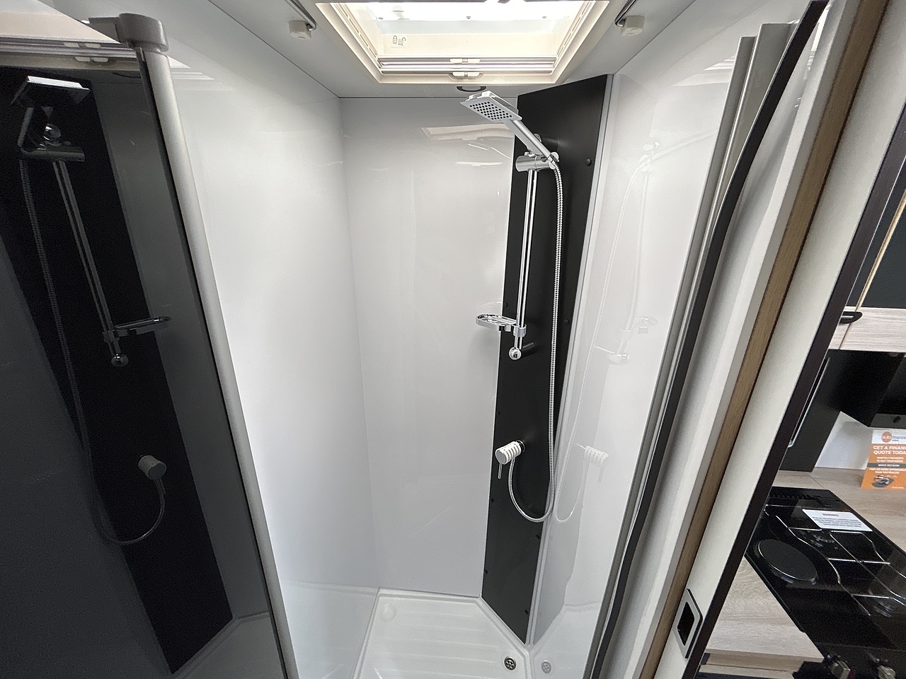 Washroom: A large rear washroom with a separate shower, cassette toilet, and washbasin.