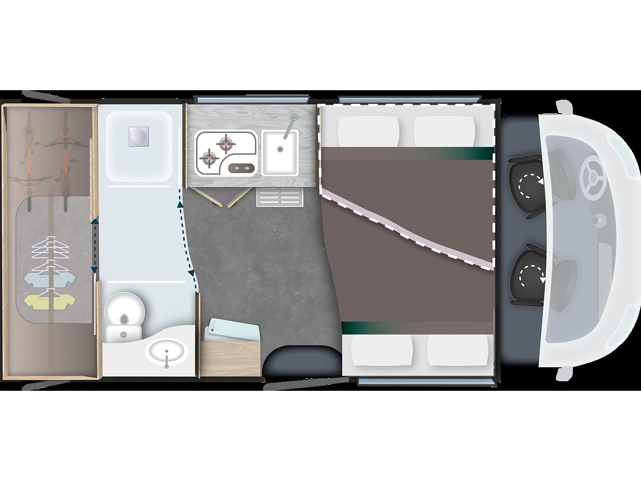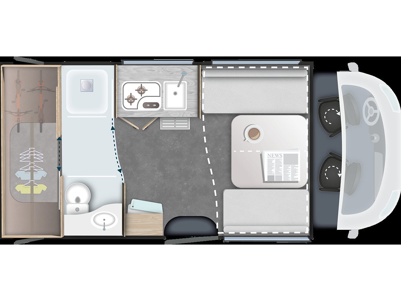 Lots of room for storage and very compact: presenting the 650 low profile motorhome! In the rear, there’s a roomy wardrobe, a hold for your bikes and a transversal bathroom; in front, there’s a SmartLounge and a hideaway bed for two. Note that the entry door passageway is 60 cm wide.