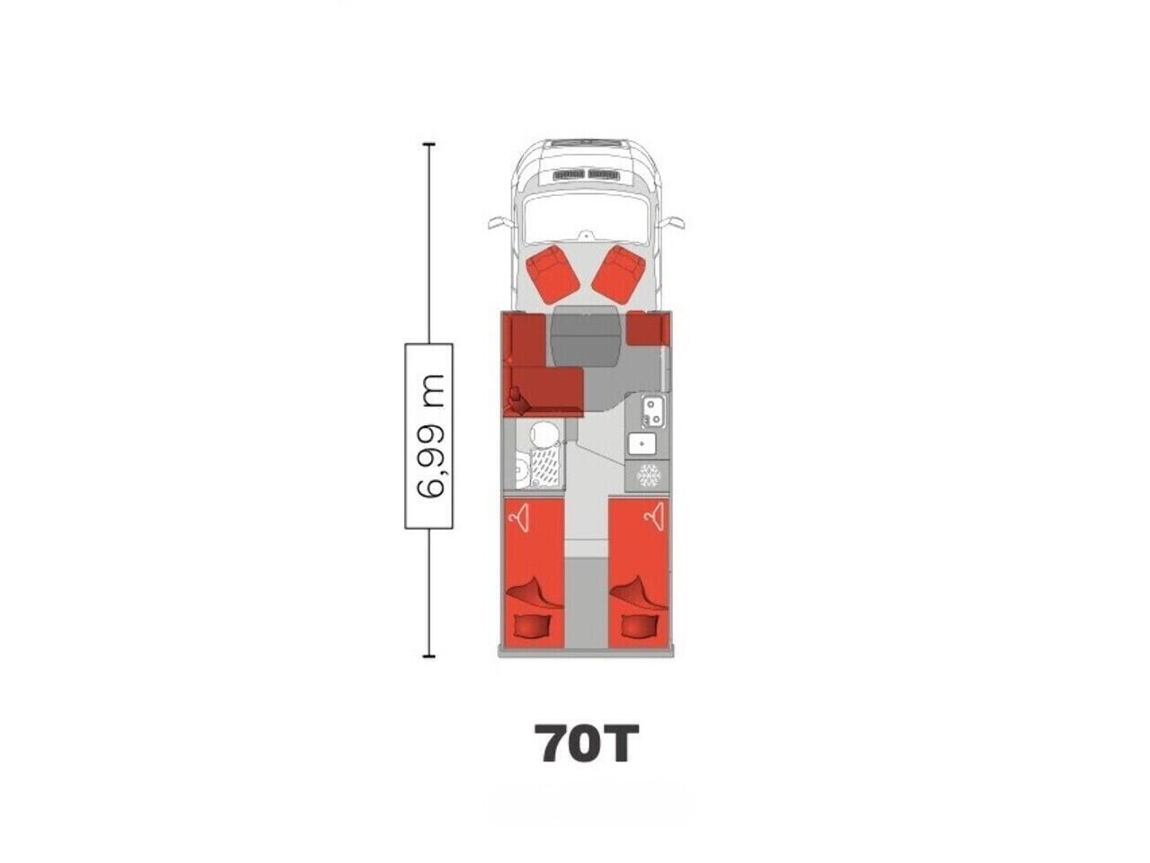 With the 70T, you can enjoy the comfort of a large and beautiful living room in a vehicle of less than 7 metres. Thanks to its modern and bright interior design, this vehicle offers pleasant living spaces. You can also benefit from a real storage capacity.