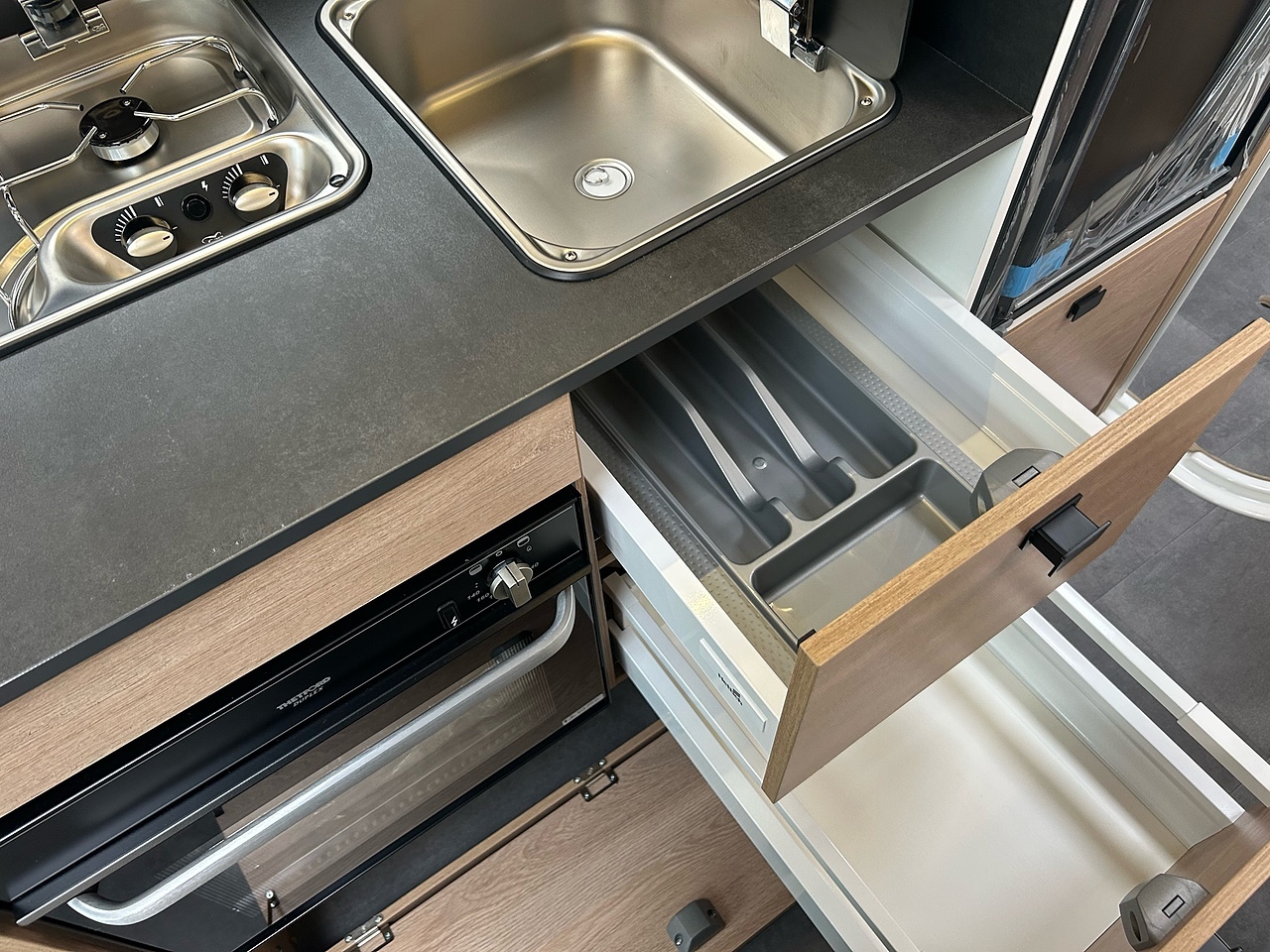 KITCHEN, 2-burner hob - 1/1.7 kW, Automatic fridge with vent covers: 133 litres, Built-in waste bin