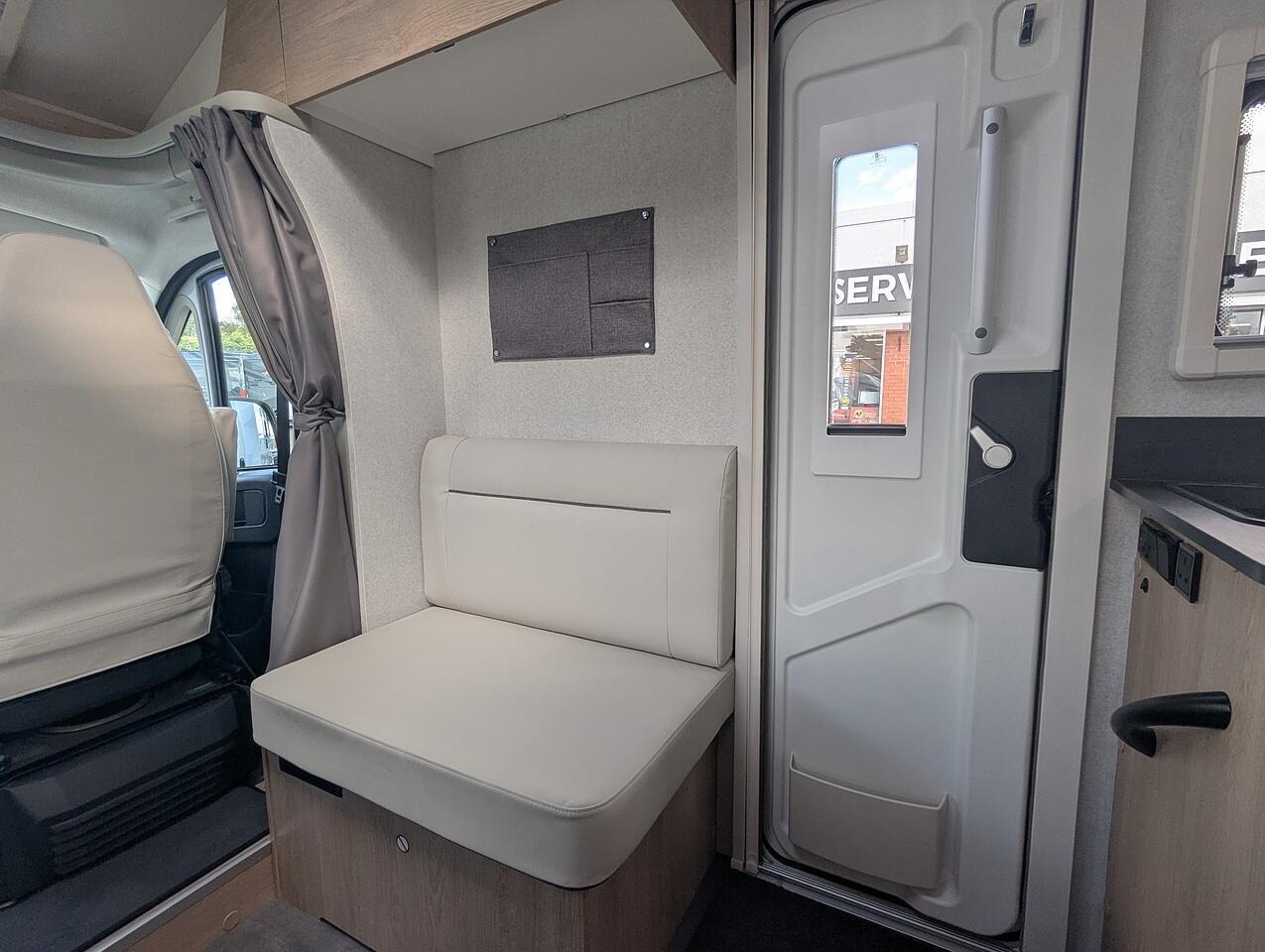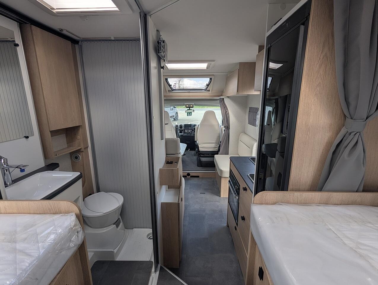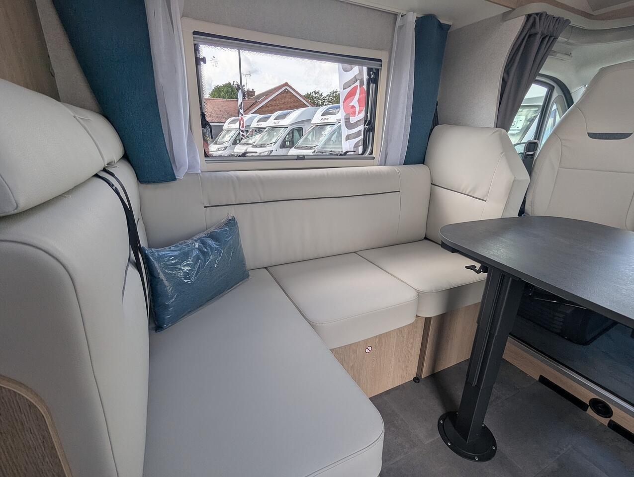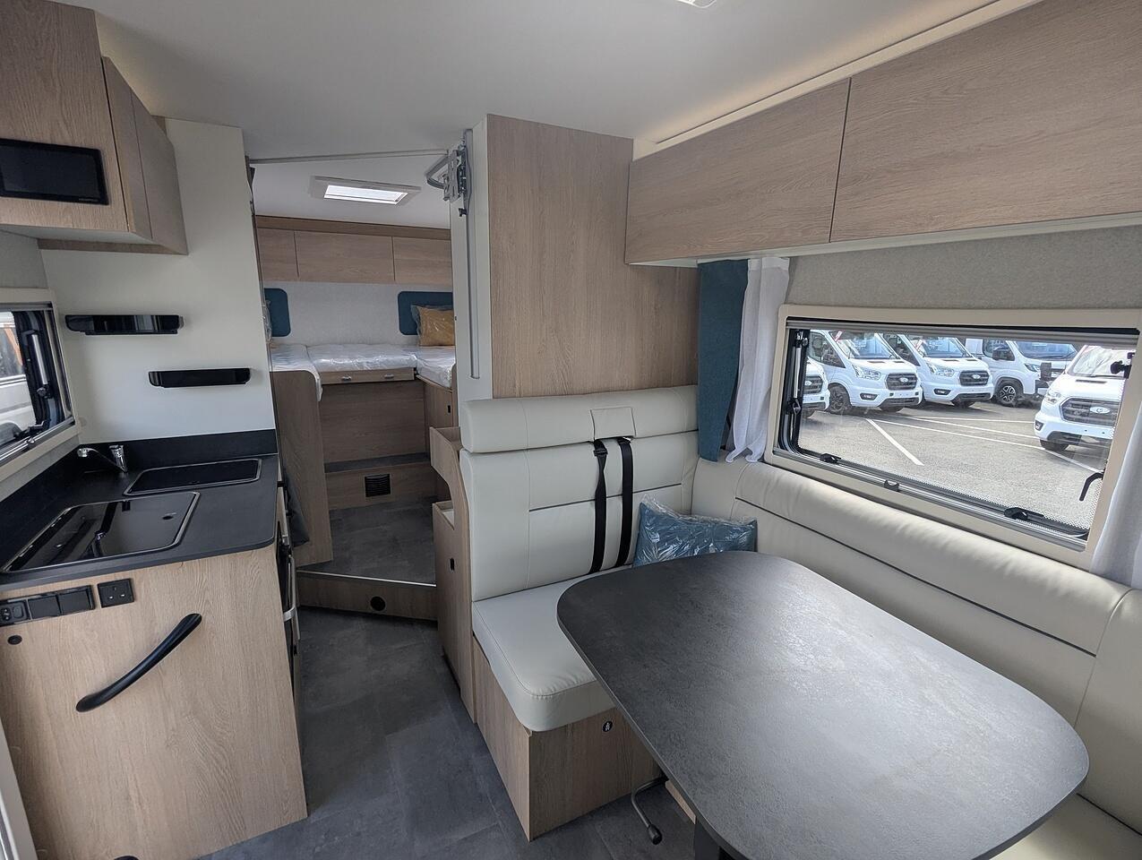 Finishe in white with gloss black alloy wheels. Extras include, Truma Combi 6EH heating system, Front sleeping arrangemnet, Oven, Cell Carpets, Heated and insolated waste water tank, Bike Rack for 2 bikes, Decrotive pillows, 22" Full HD TV & WiFi Antenna.