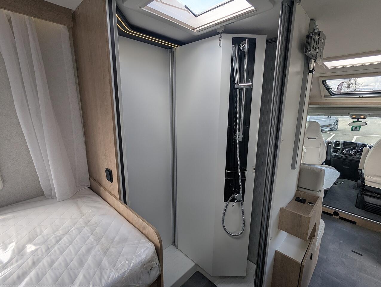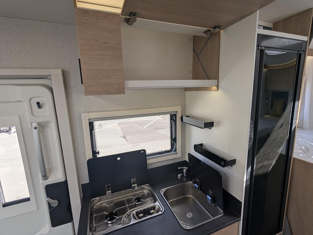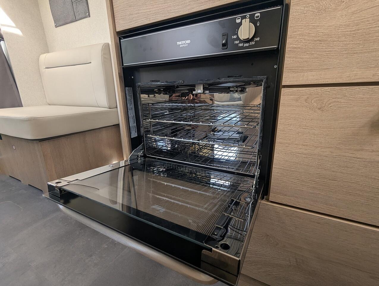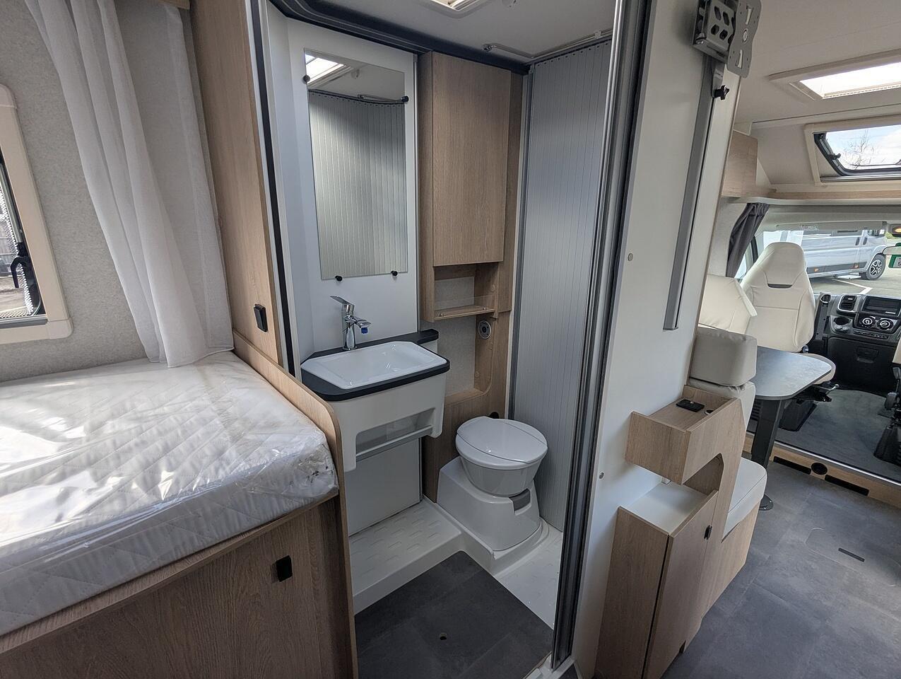 Finishe in white with gloss black alloy wheels. Extras include, Truma Combi 6EH heating system, Front sleeping arrangemnet, Oven, Cell Carpets, Heated and insolated waste water tank, Bike Rack for 2 bikes, Decrotive pillows, 22" Full HD TV & WiFi Antenna.