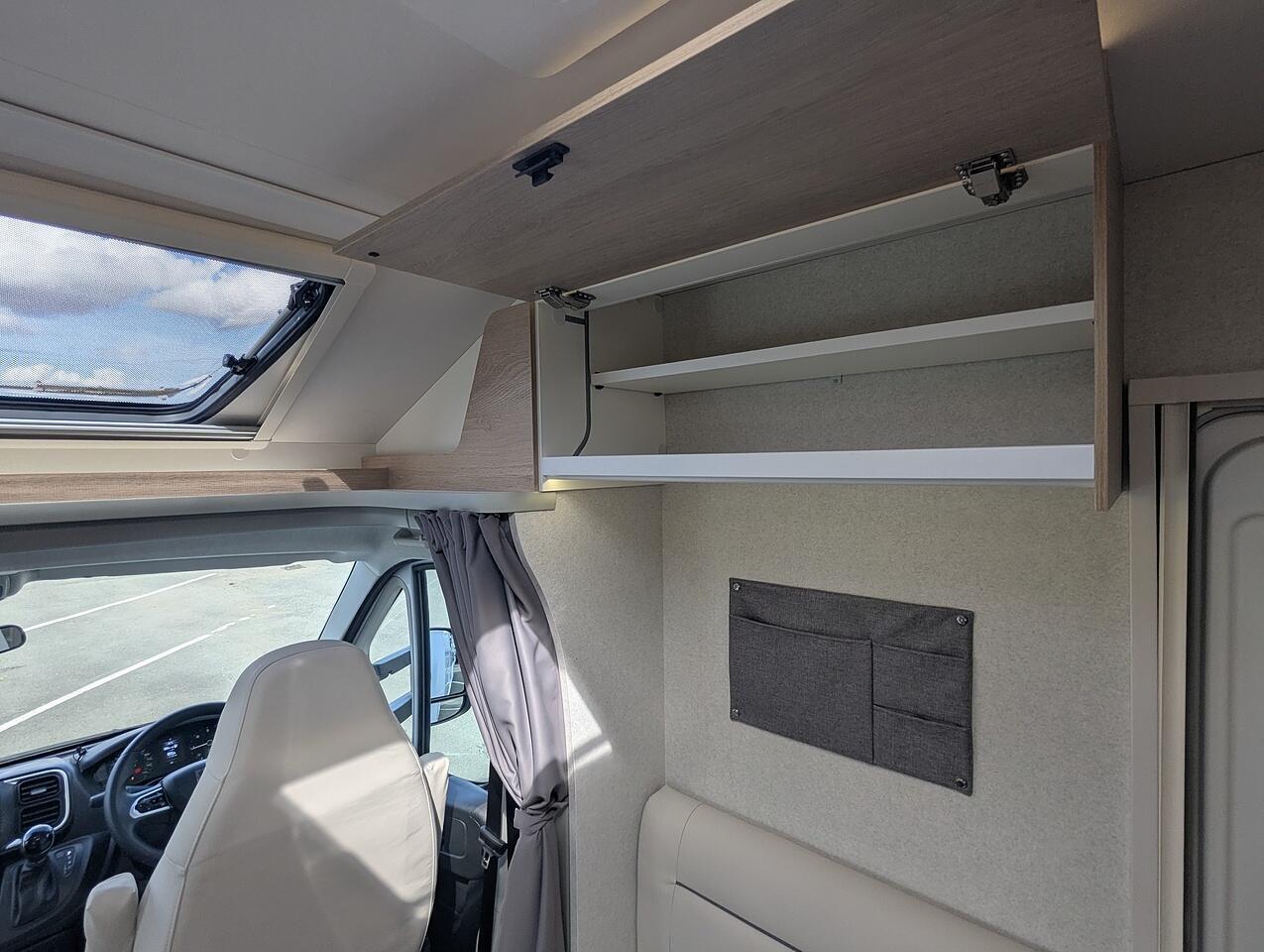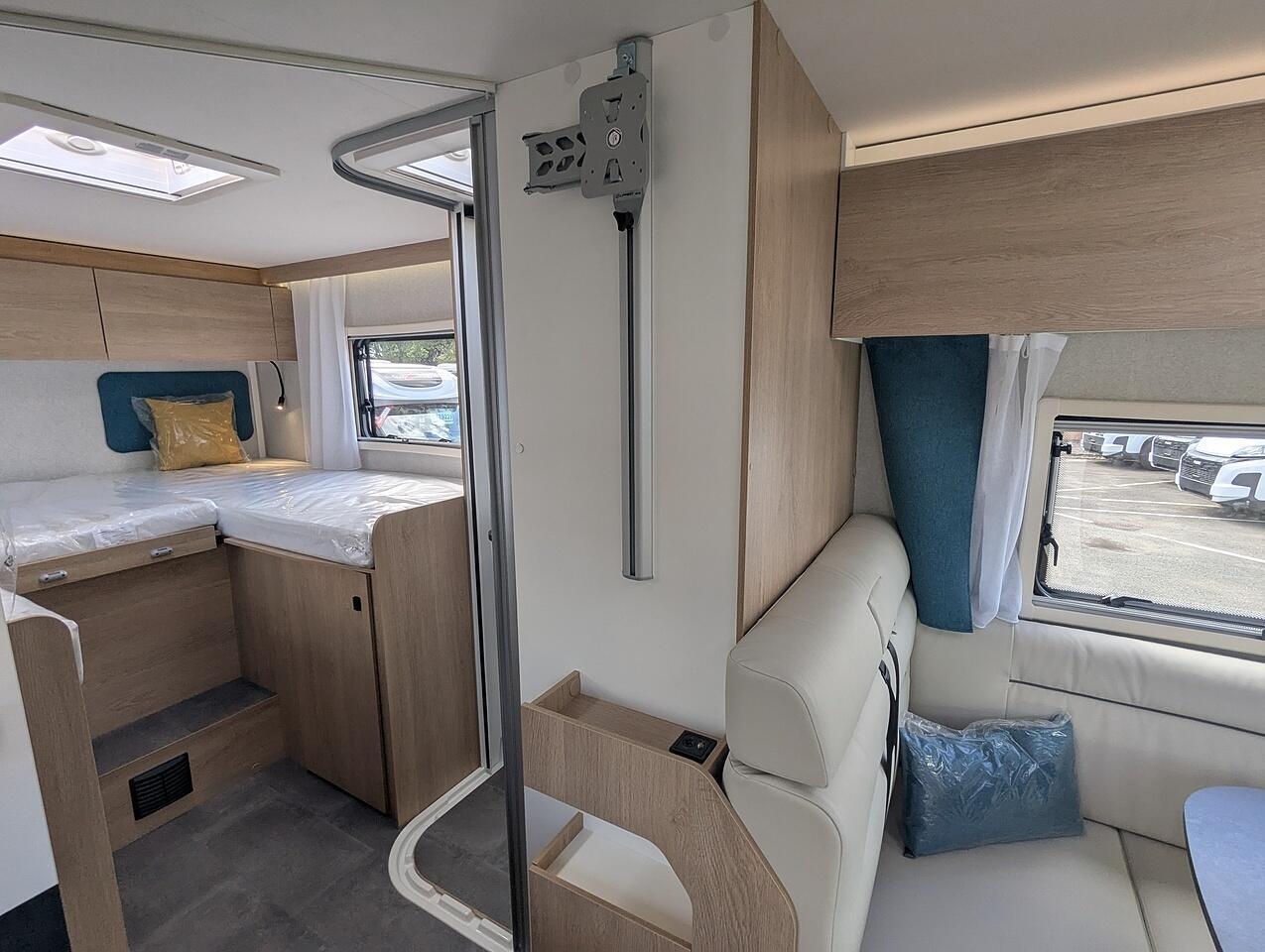 Time to relax in the 75T’s spacious living room. Enjoy the bright, modern design of this 5-person motorhome, along with its huge storage area and numerous storage units.
