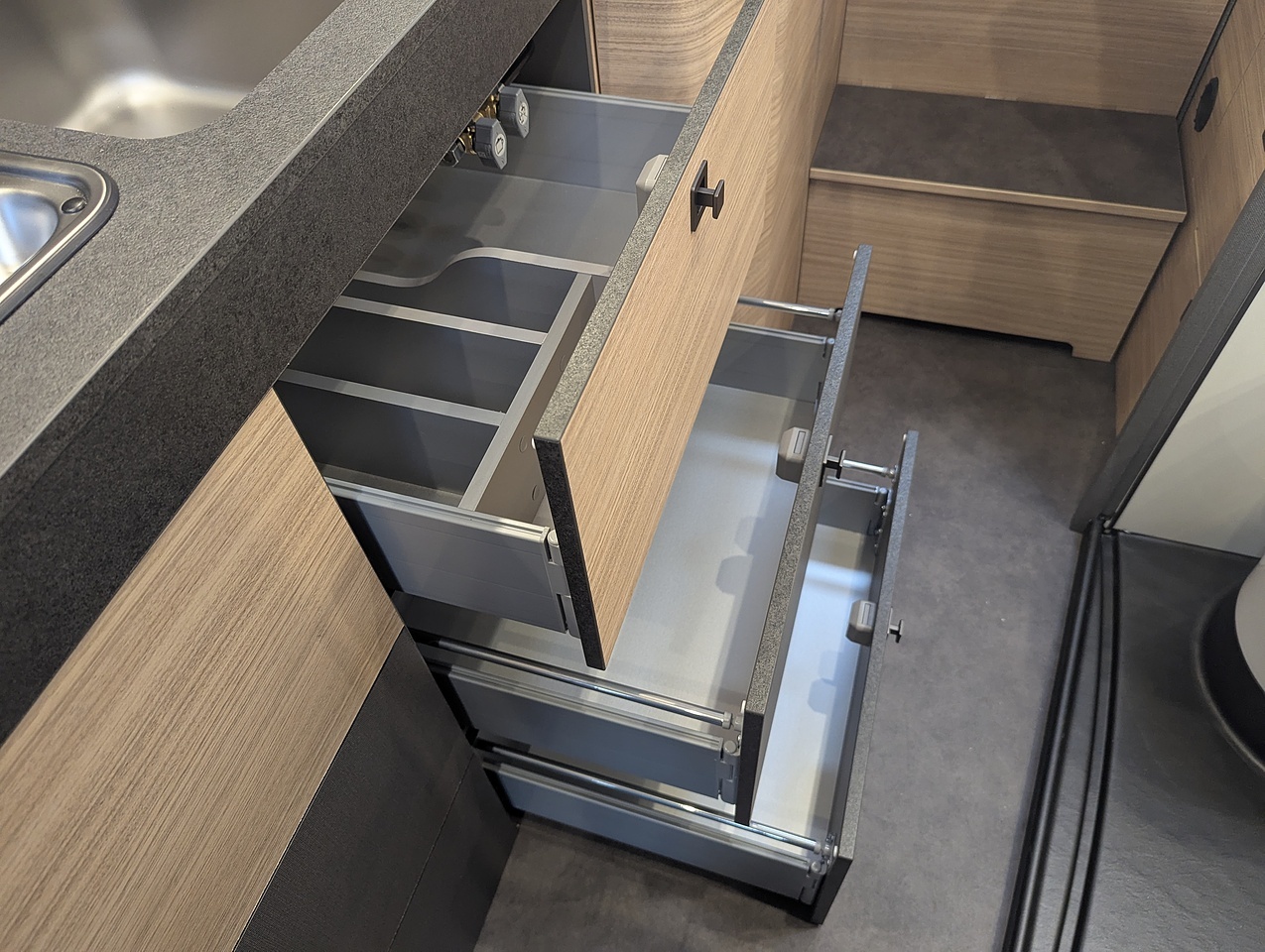 When going on holiday, you don't want to have to leave things behind. Especially because of a lack of storage space. That's why the Malibu relax offers a wide range of options when it comes to stowing away everything that you need for your holiday. From the extra large storage compartment in the double floor, to the large overhead storage cabinets and numerous kitchen drawers, through to the premium wardrobe, as well as the laundry compartment under the lengthways single beds, there's definitely enough space for everything!