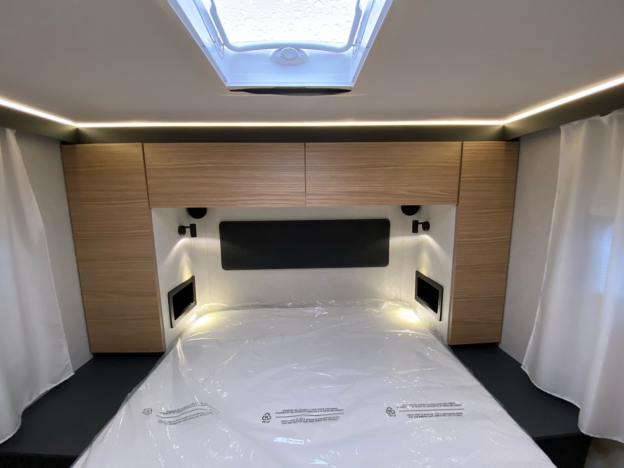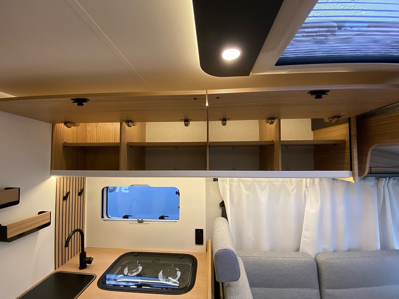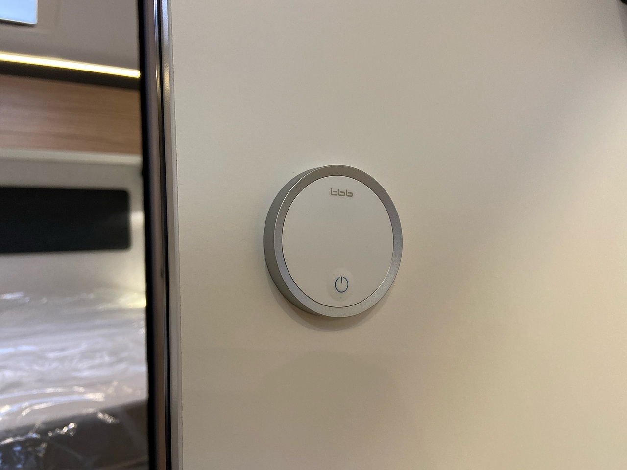 Two large bench seats face each other in this beautifully finished living room. In the centre, a large folding table seats 5. The elegance of the wood, the large windows and the numerous LED lights all contribute to the warm ambience of this beautiful living space. Compatible with ALDE heating, it will allow you to travel in any season.