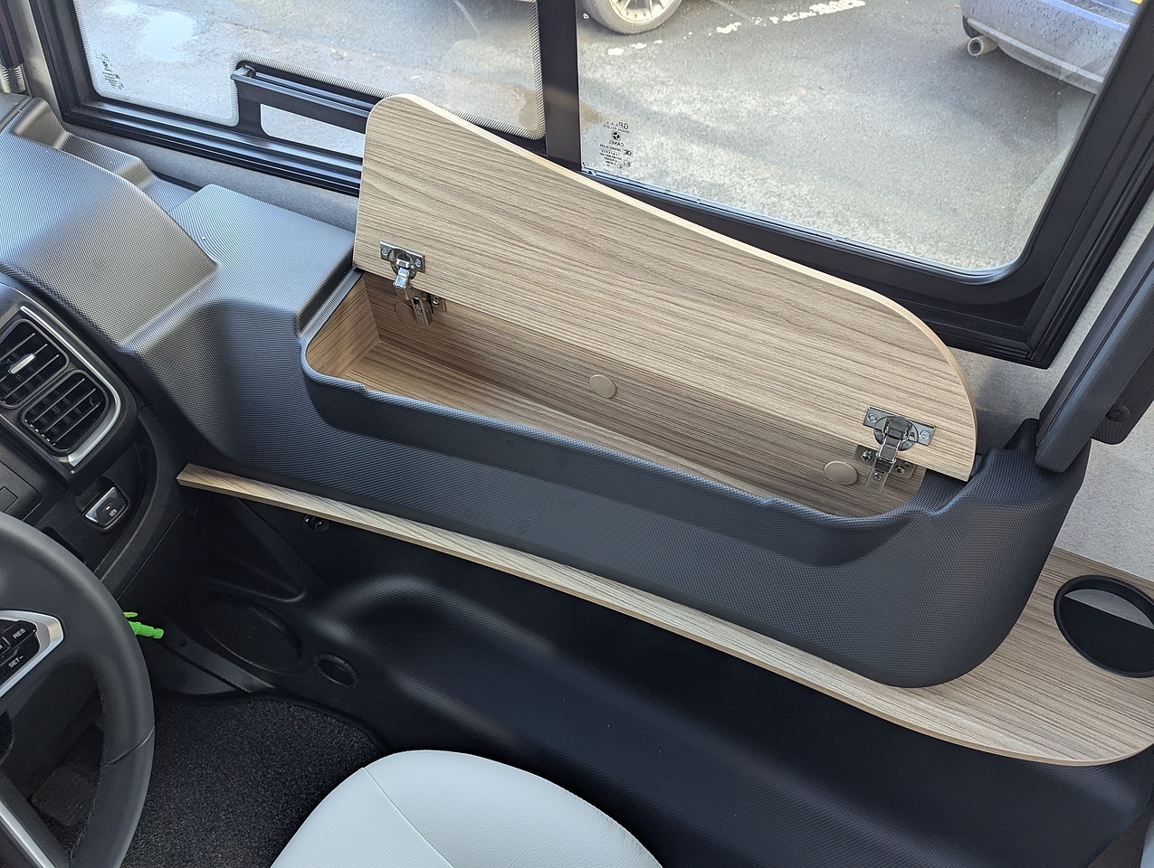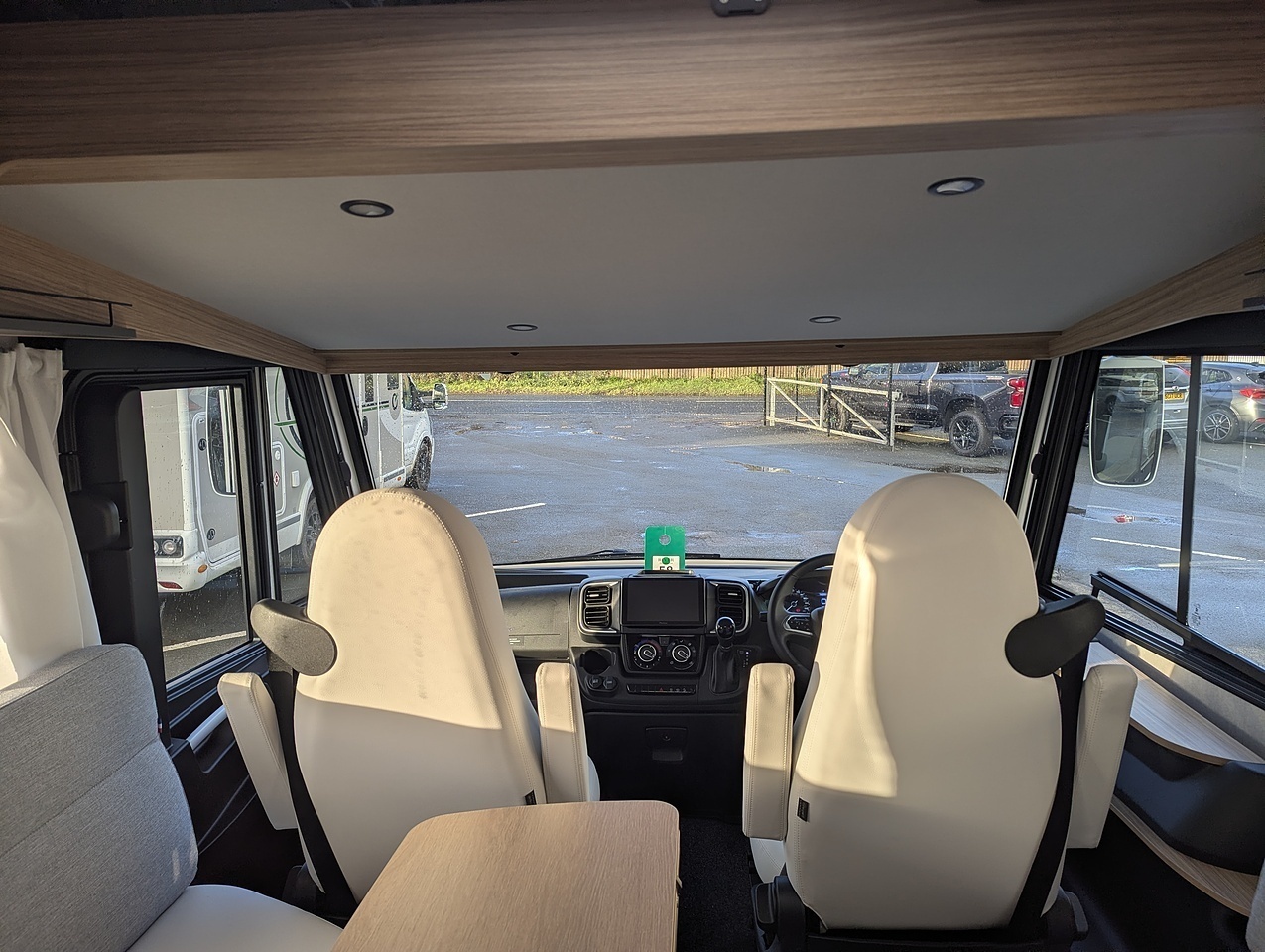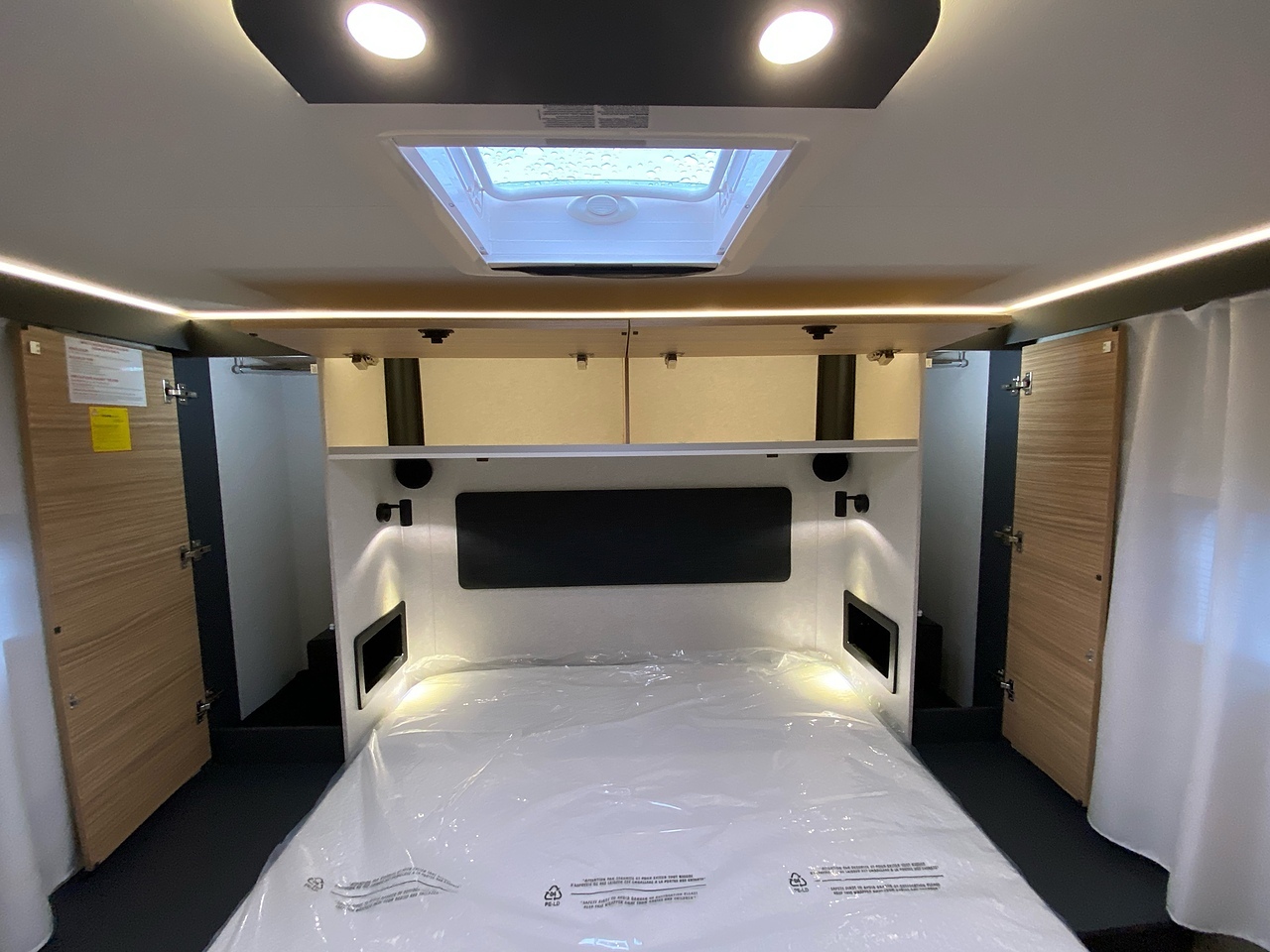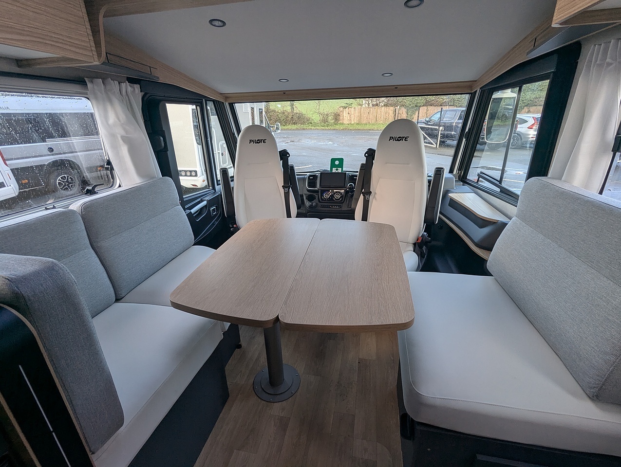 Two large bench seats face each other in this beautifully finished living room. In the centre, a large folding table seats 5. The elegance of the wood, the large windows and the numerous LED lights all contribute to the warm ambience of this beautiful living space. Compatible with ALDE heating, it will allow you to travel in any season.