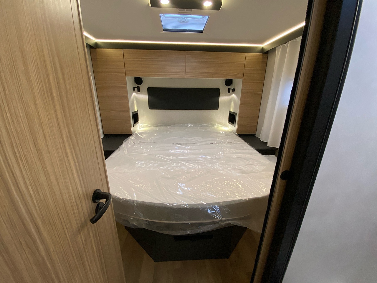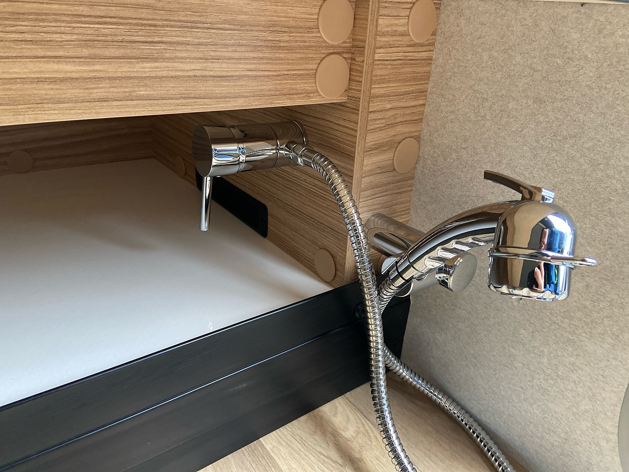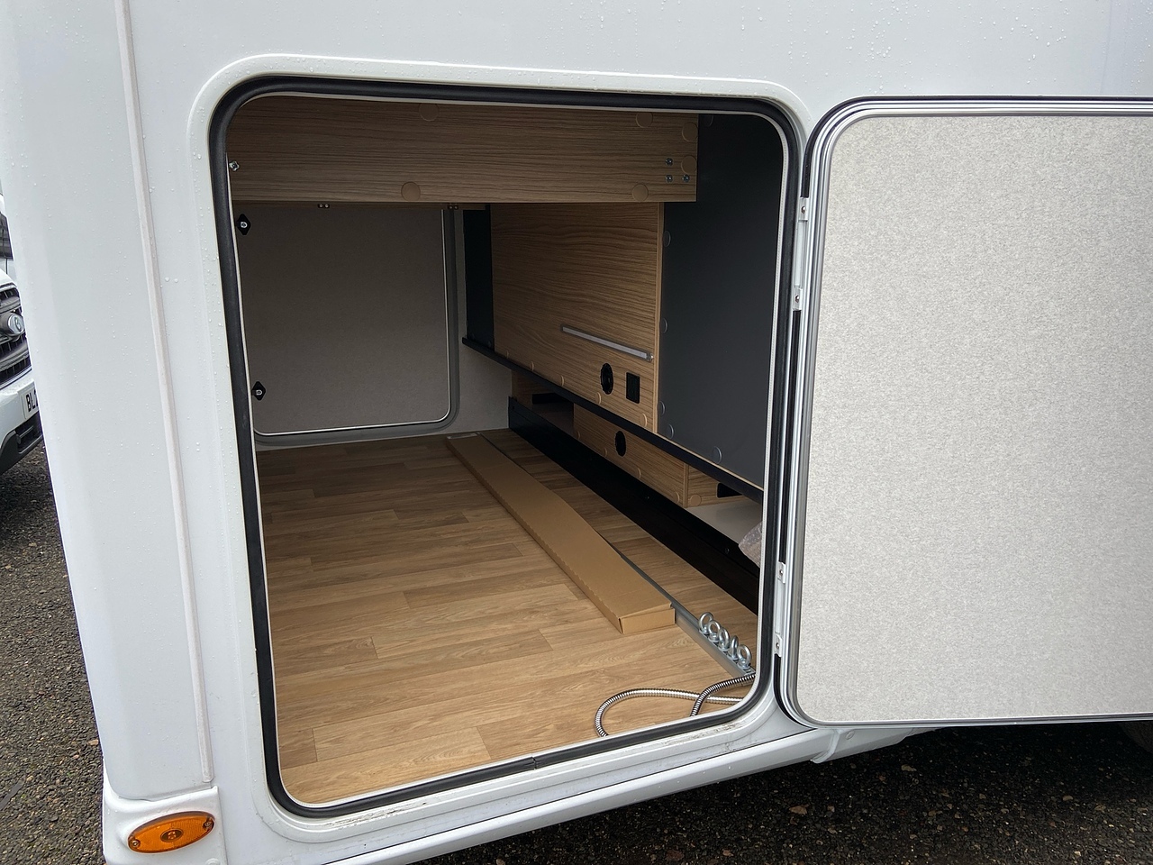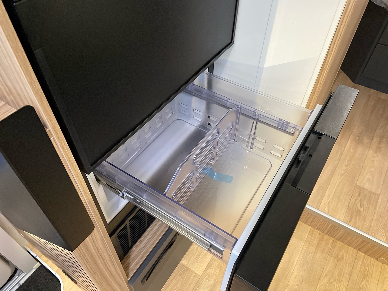 The huge garage allows you to store your belongings safely. The storage area boasts excellent height, ideal for transporting tall and bulky items. The doors are equipped with double compression latches which provide an air- and water- tight seal. In the garage there is a 230v socket and a shower.