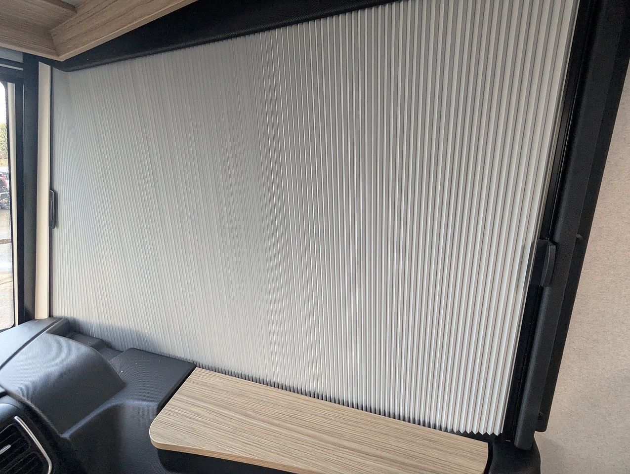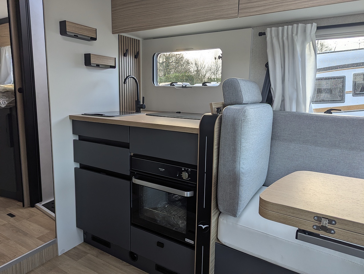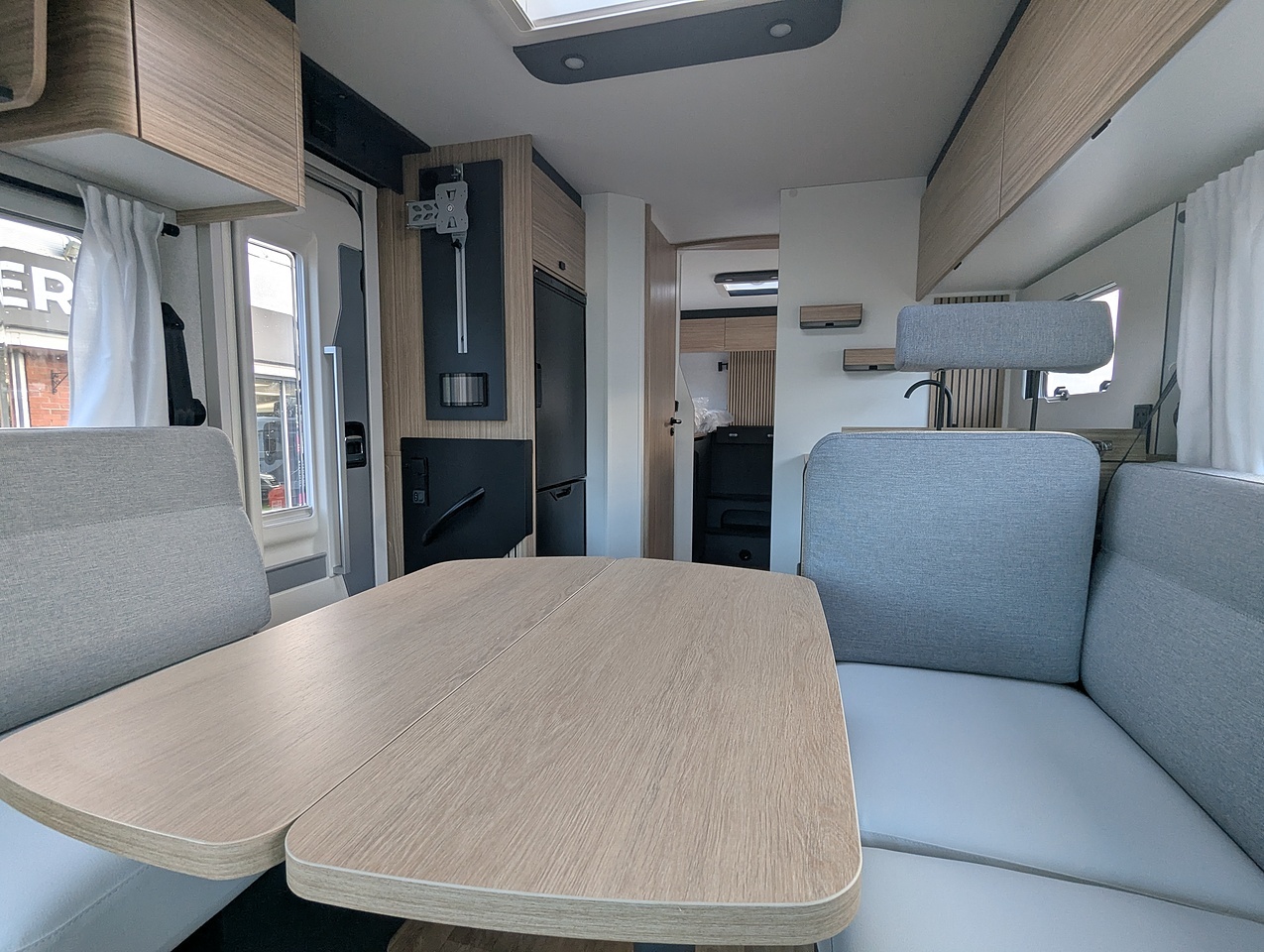 Two large bench seats face each other in this beautifully finished living room. In the centre, a large folding table seats 5. The elegance of the wood, the large windows and the numerous LED lights all contribute to the warm ambience of this beautiful living space. Compatible with ALDE heating, it will allow you to travel in any season.