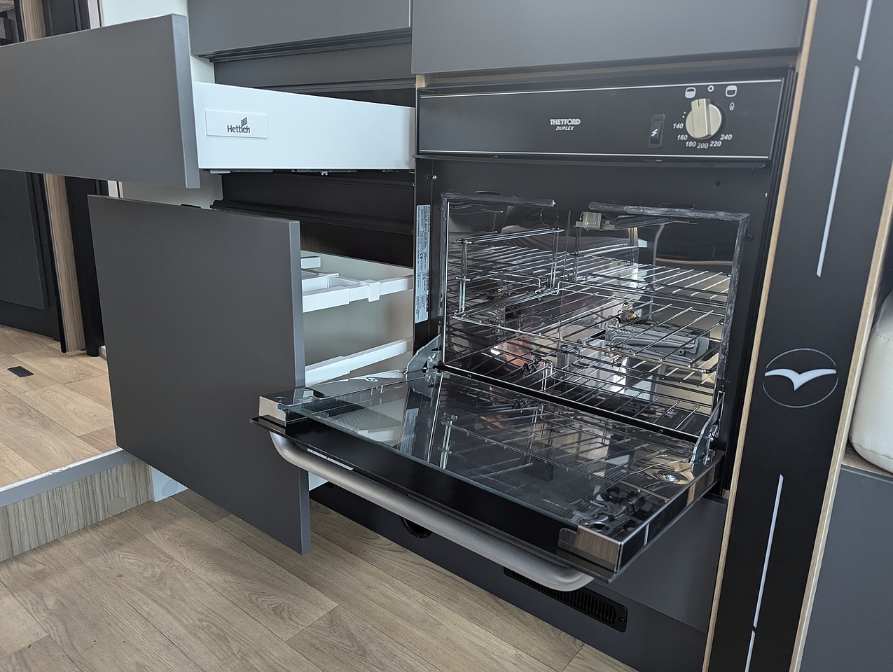 You will love its dynamic, modern look. The easy-access gas cylinder compartment has a shelf which can be lowered, making it easy to change your bottles. Its wall-to-wall double 15 cm floor provides great insulation as well as additional storage.