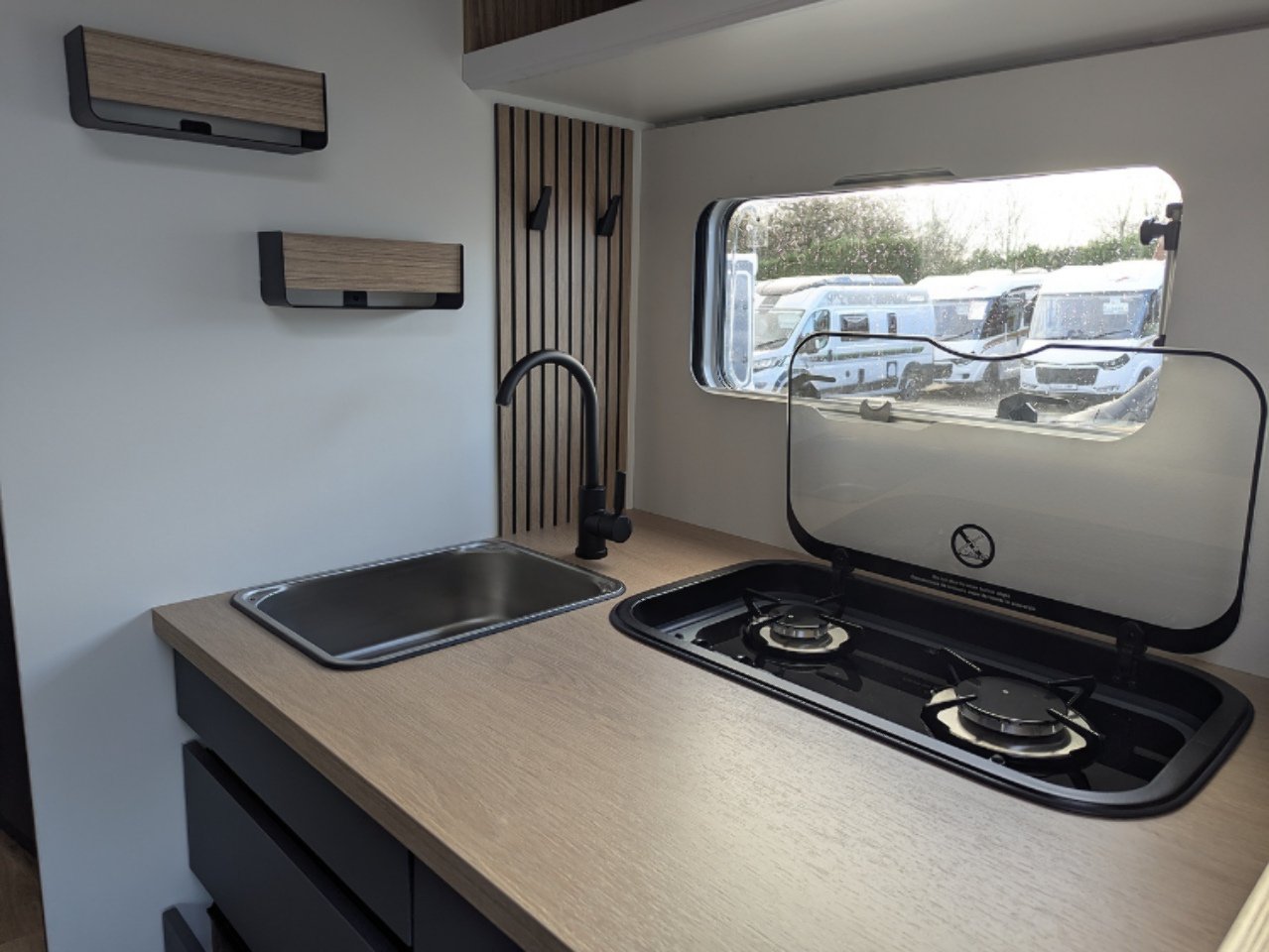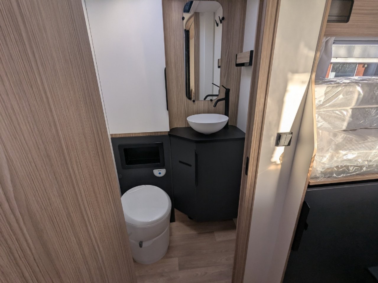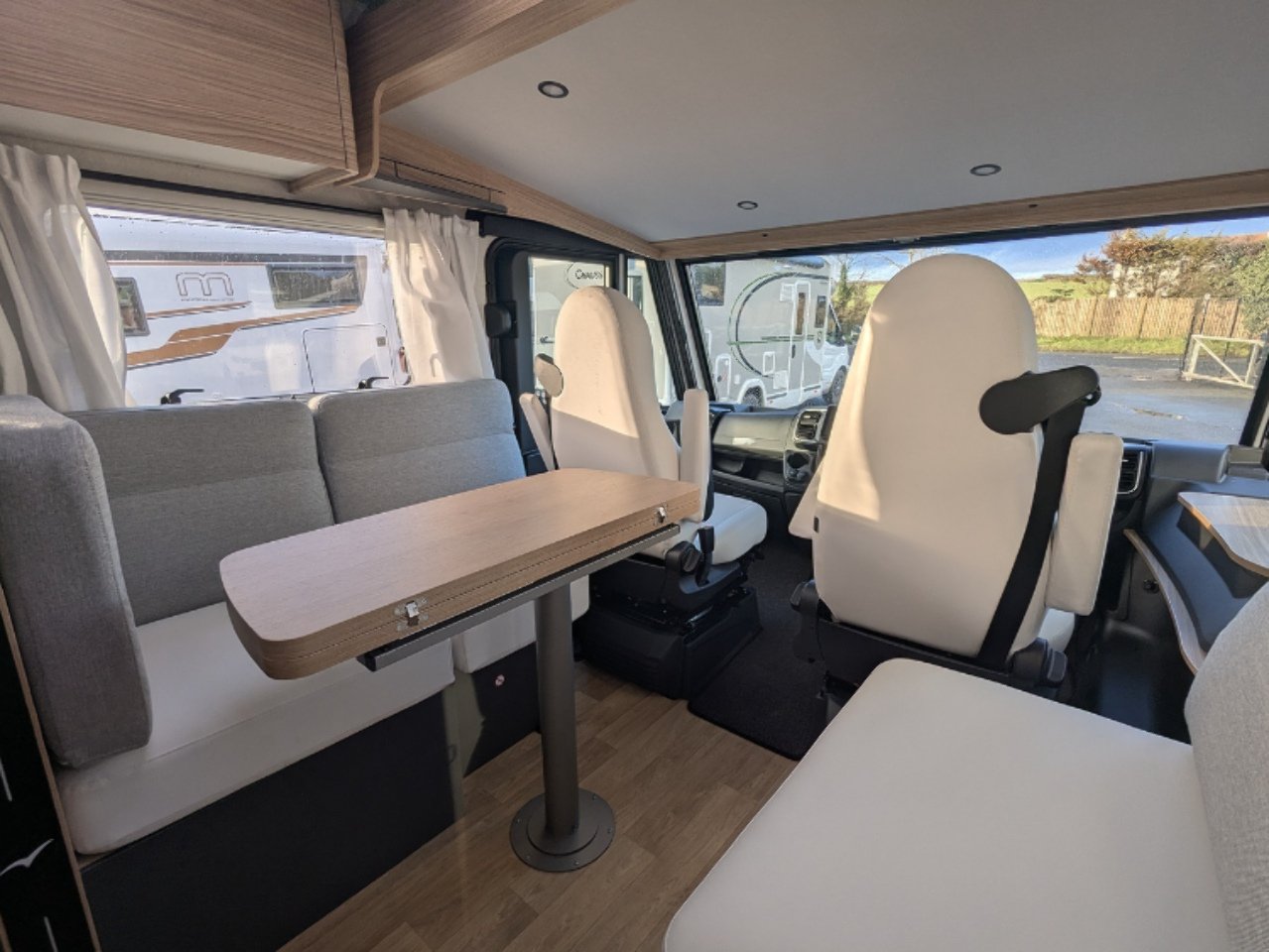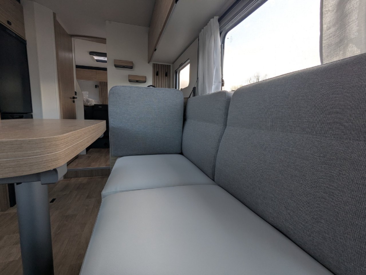 Two large bench seats face each other in this beautifully finished living room. In the centre, a large folding table seats 5. The elegance of the wood, the large windows and the numerous LED lights all contribute to the warm ambience of this beautiful living space. Compatible with ALDE heating, it will allow you to travel in any season.
