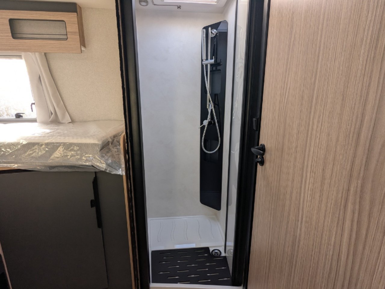 This vehicle features a comfortable shower separate from the bathroom. Sliding partitions close it off from the bedroom and lounge, giving you a perfectly private space.