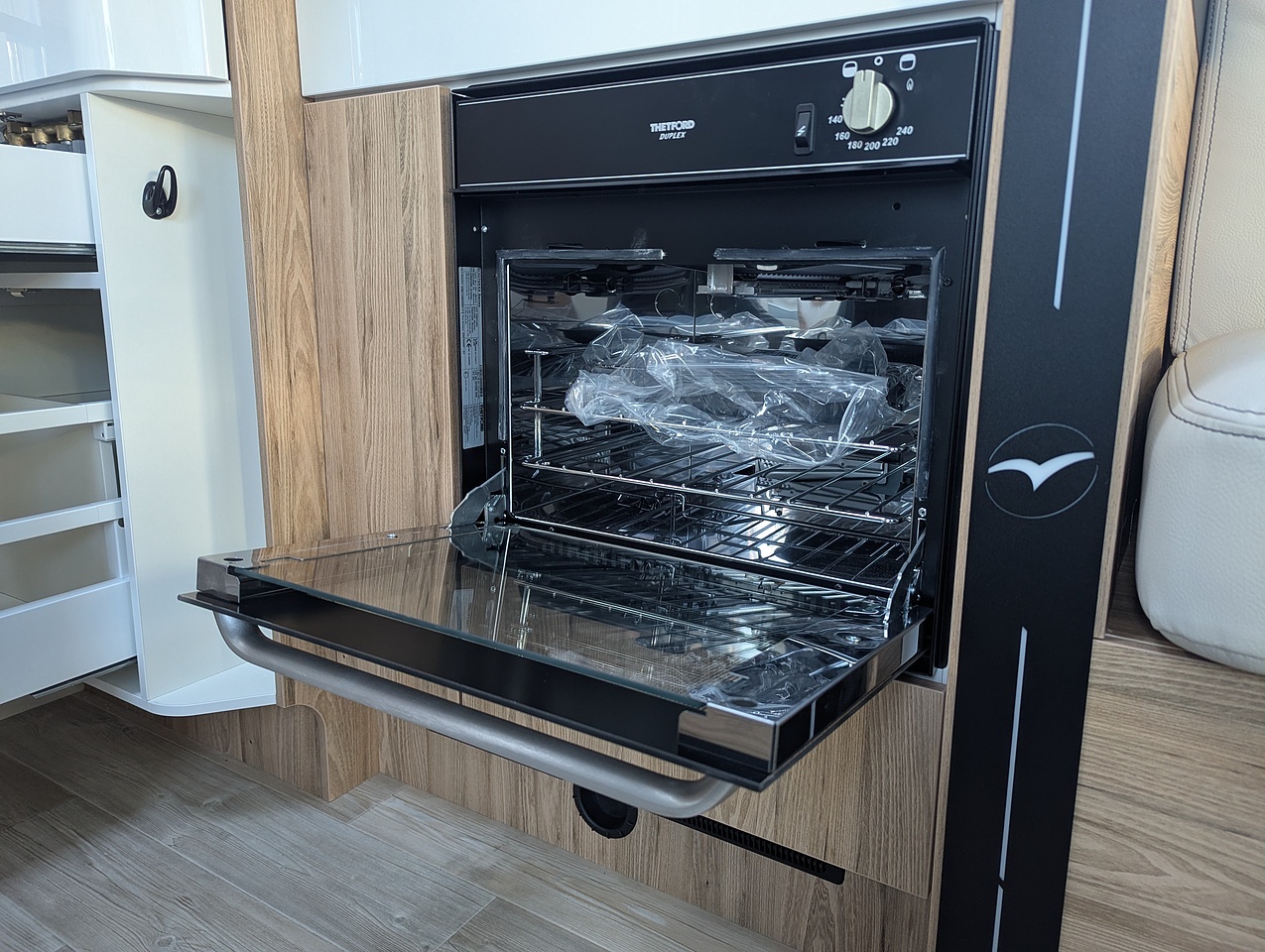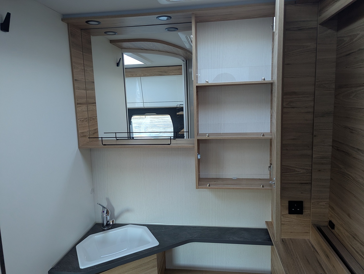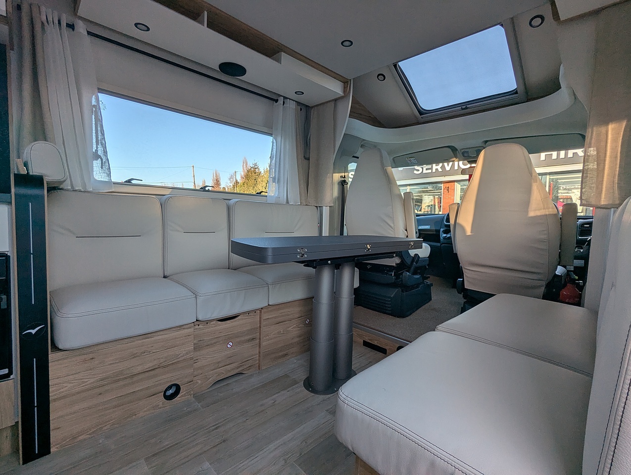 Inside, the bright and contemporary living space welcomes you with premium finishes, smart storage solutions, and a well-thought-out layout. The spacious lounge converts effortlessly for relaxing or dining, while the drop-down bed provides a comfortable sleeping solution without sacrificing daytime space.