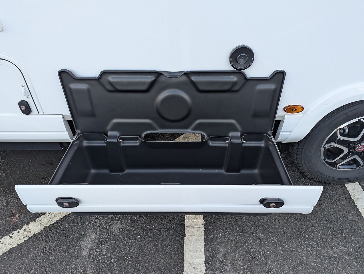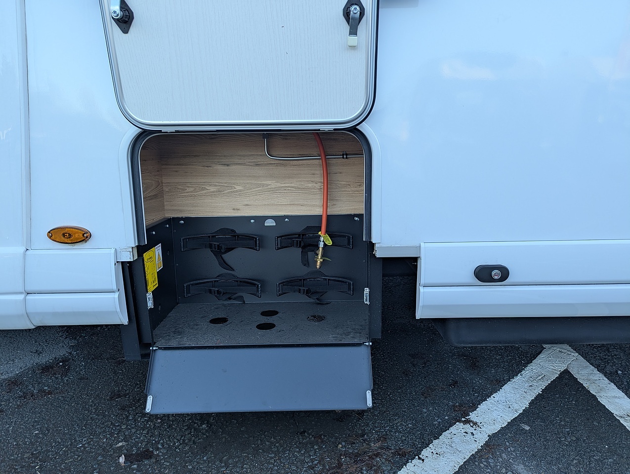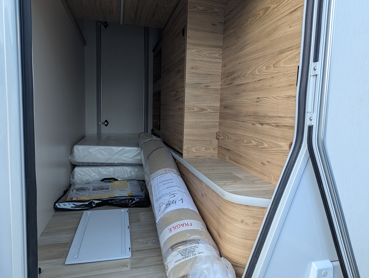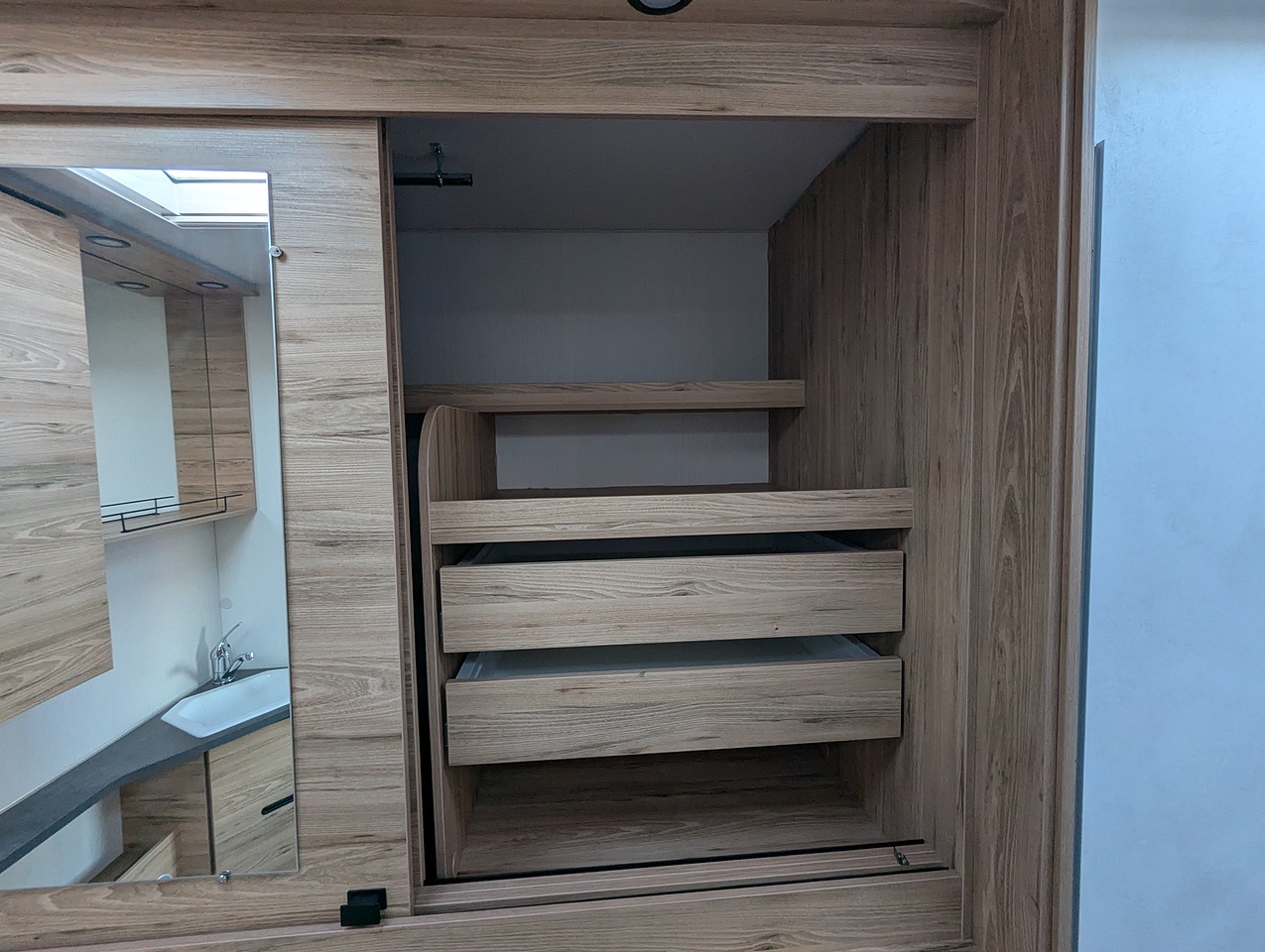 Inside, the bright and contemporary living space welcomes you with premium finishes, smart storage solutions, and a well-thought-out layout. The spacious lounge converts effortlessly for relaxing or dining, while the drop-down bed provides a comfortable sleeping solution without sacrificing daytime space.