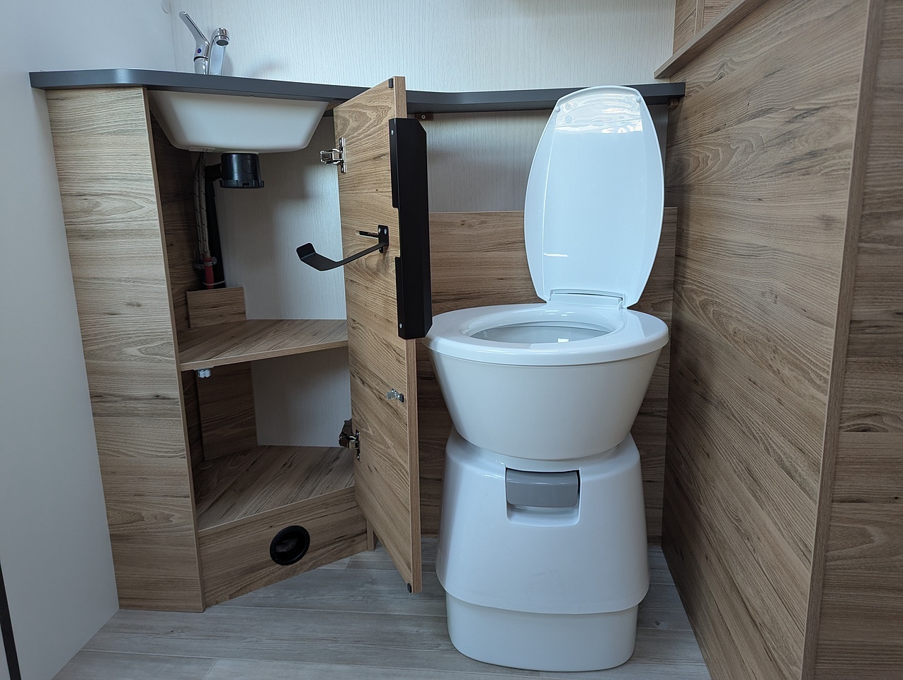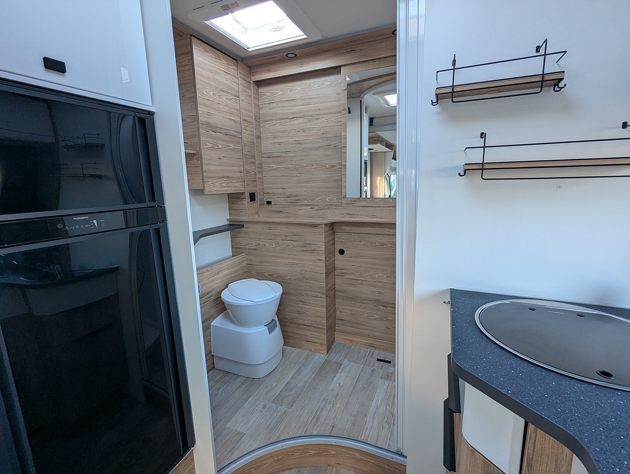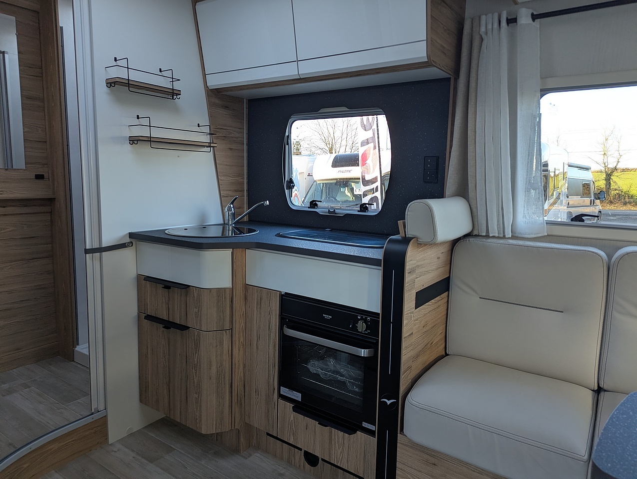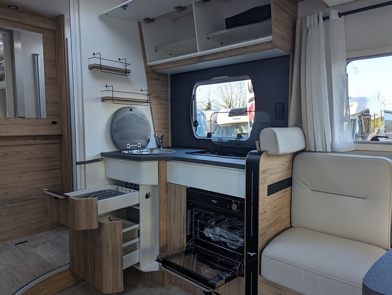 A well-equipped kitchen makes meals on the road a pleasure, and the stylish washroom offers both convenience and privacy.