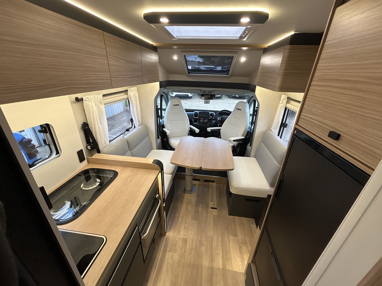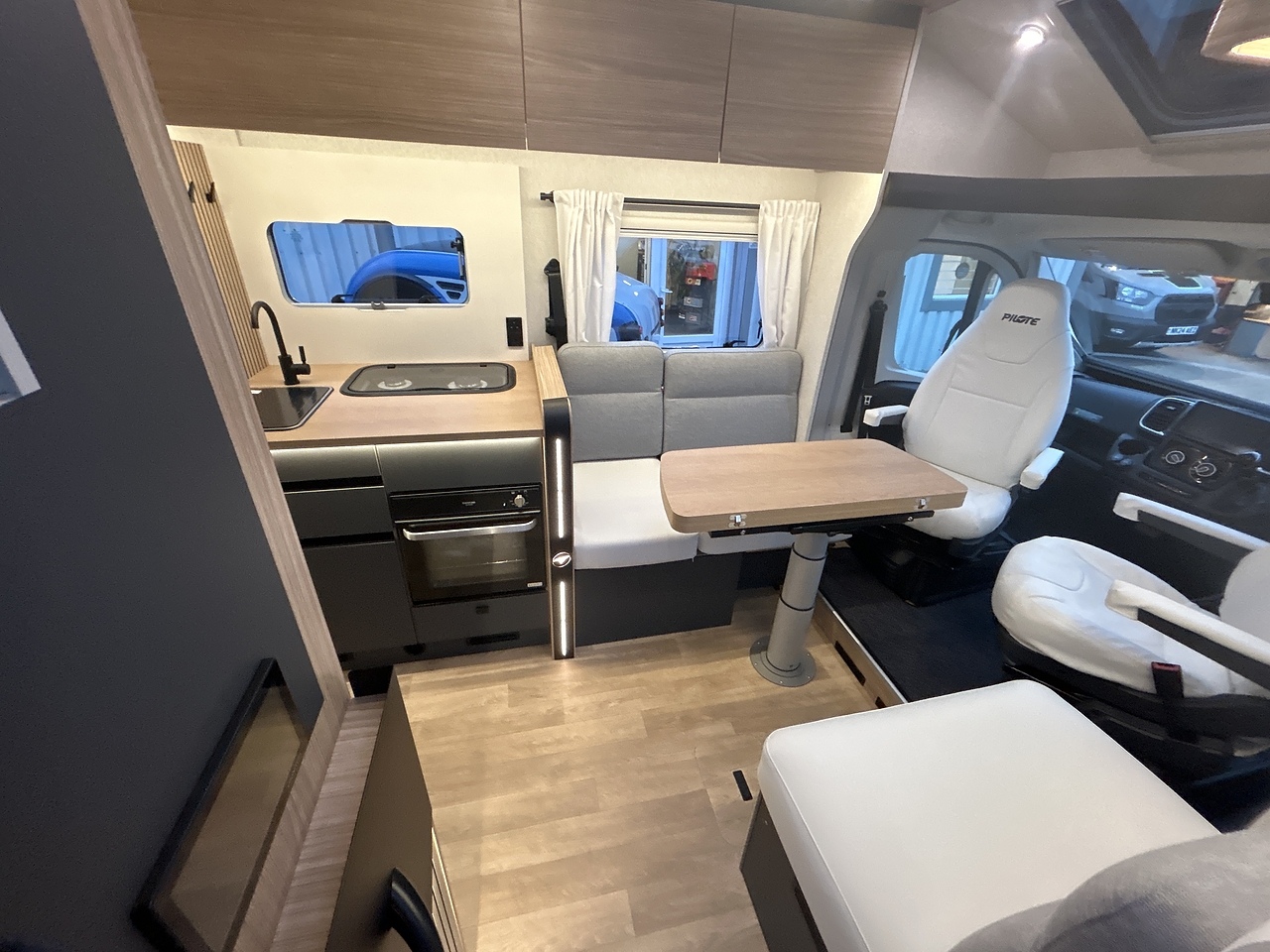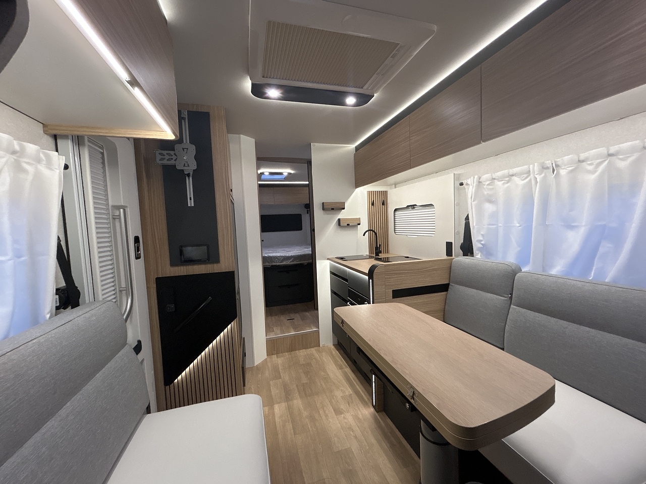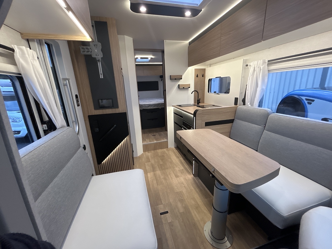 Large convivial lounge, with a capacity of 5 people. The living room is bright thanks to the skydome, a real panoramic roof. The folding and sliding table makes it easy to move around.