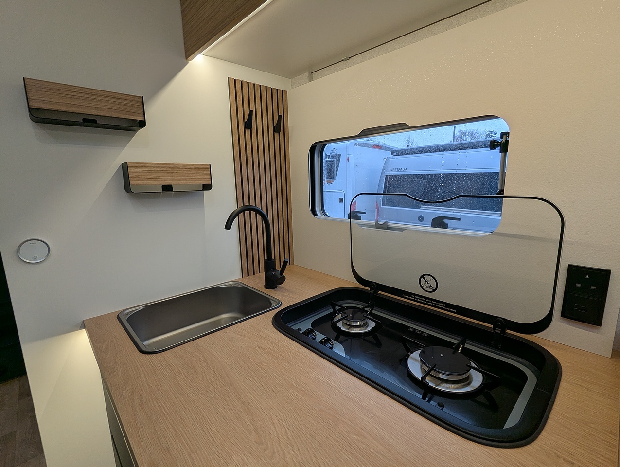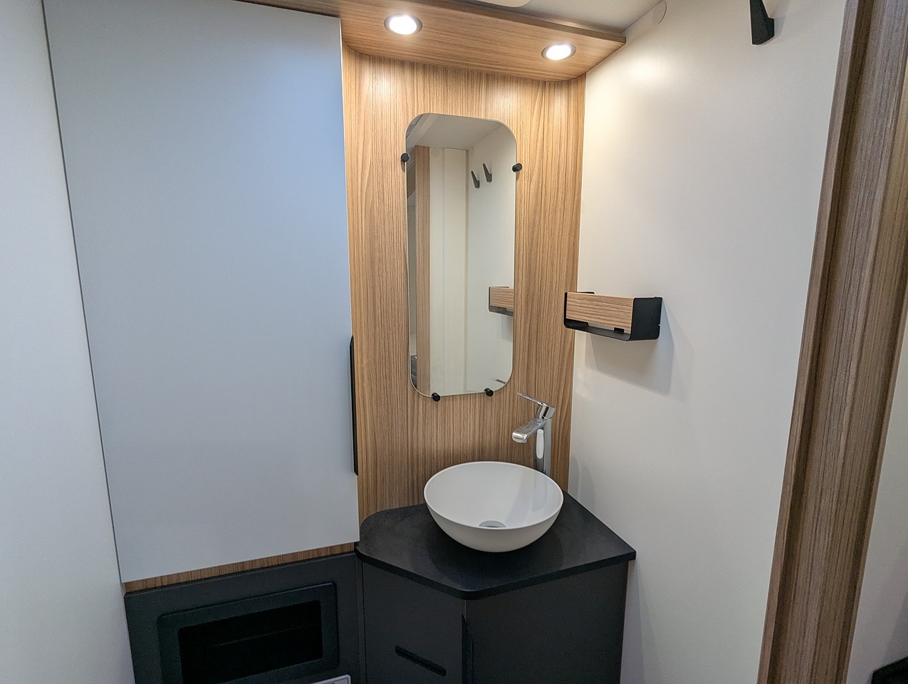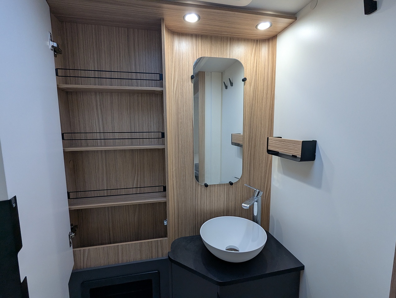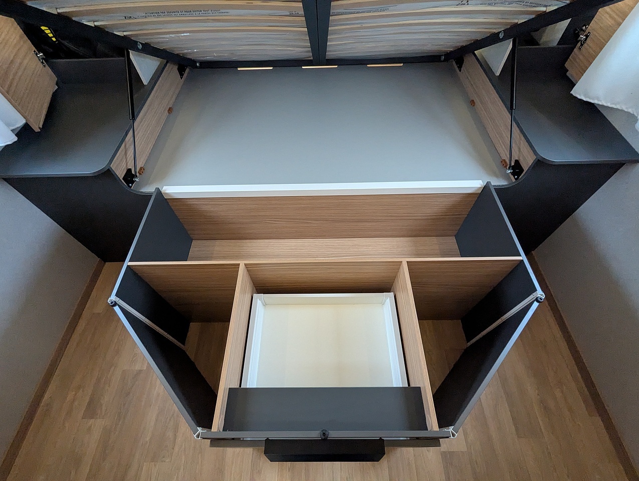 This low-profile has a large lounge with face-to-face bench seats. 5 people can be seated around the fold-out dining table. It’s a perfect layout, both for entertaining and in terms of ease of movement.