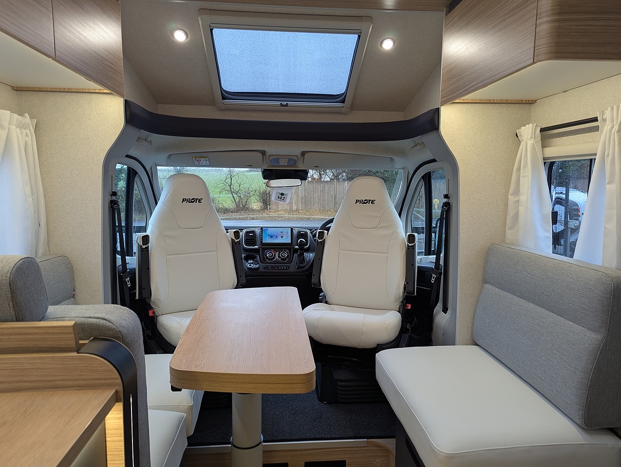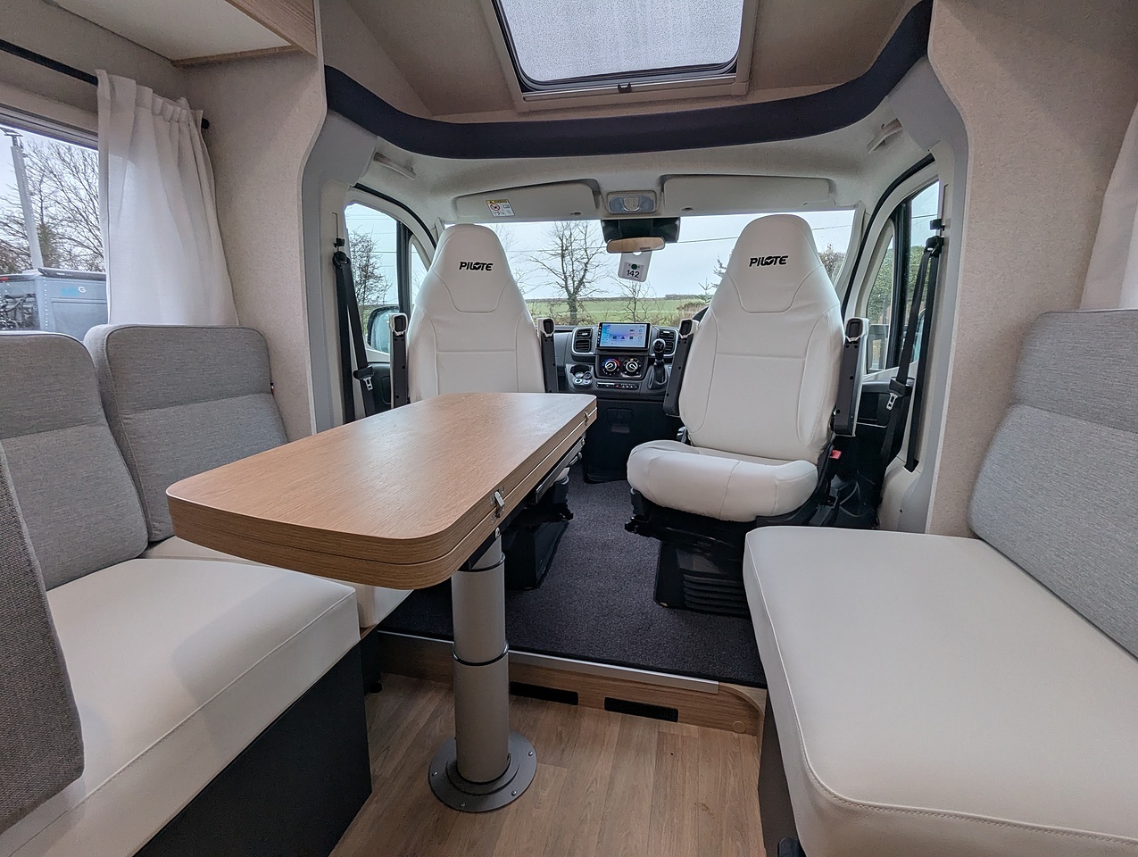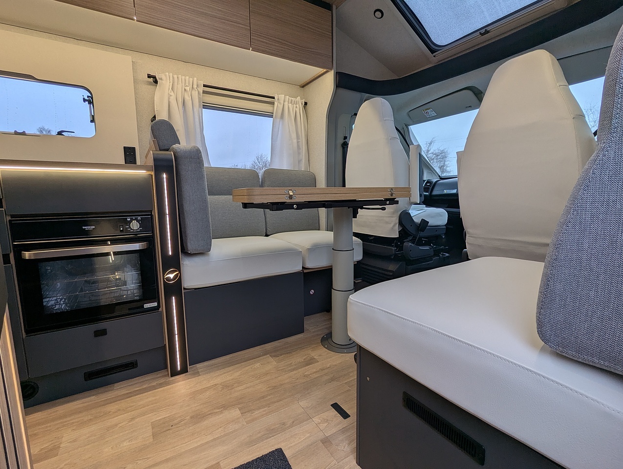 Large living room for up to 5 people. The skydome and panoramic roof give the living room plenty of light. The folding and sliding table makes it easy to move around.