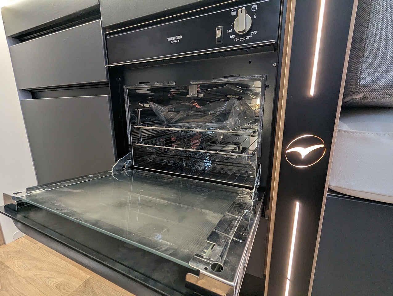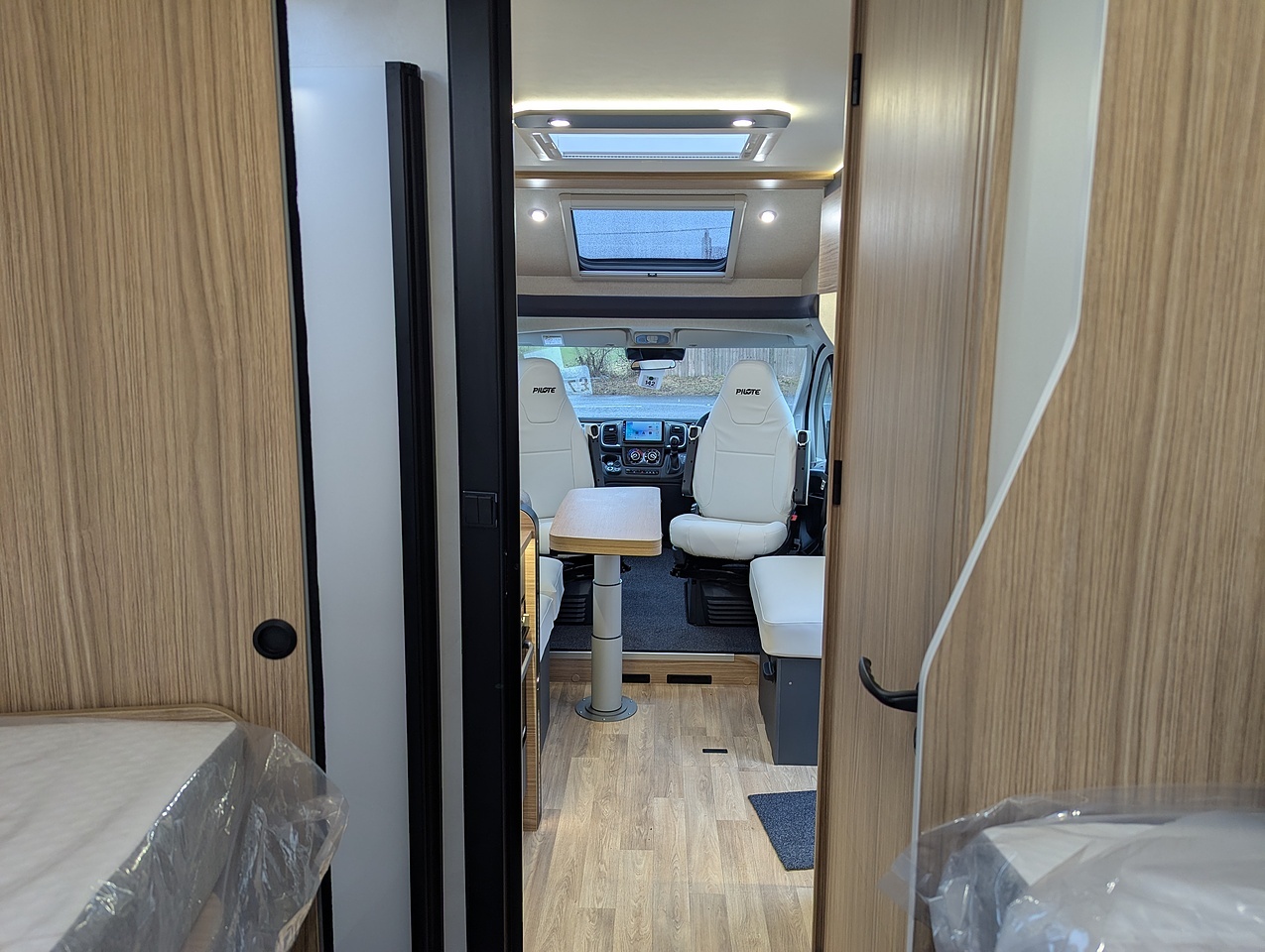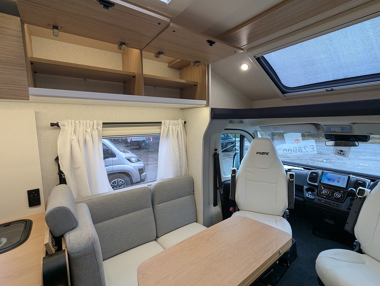 Large living room for up to 5 people. The skydome and panoramic roof give the living room plenty of light. The folding and sliding table makes it easy to move around.