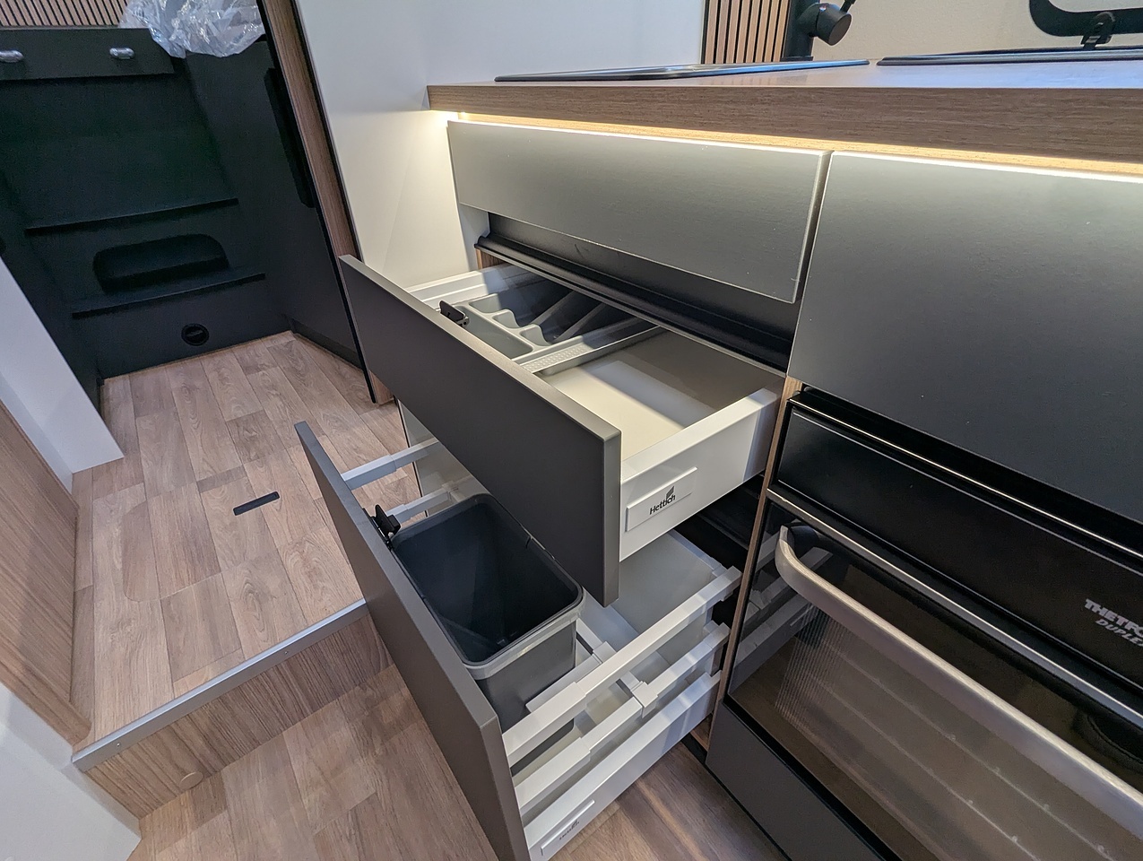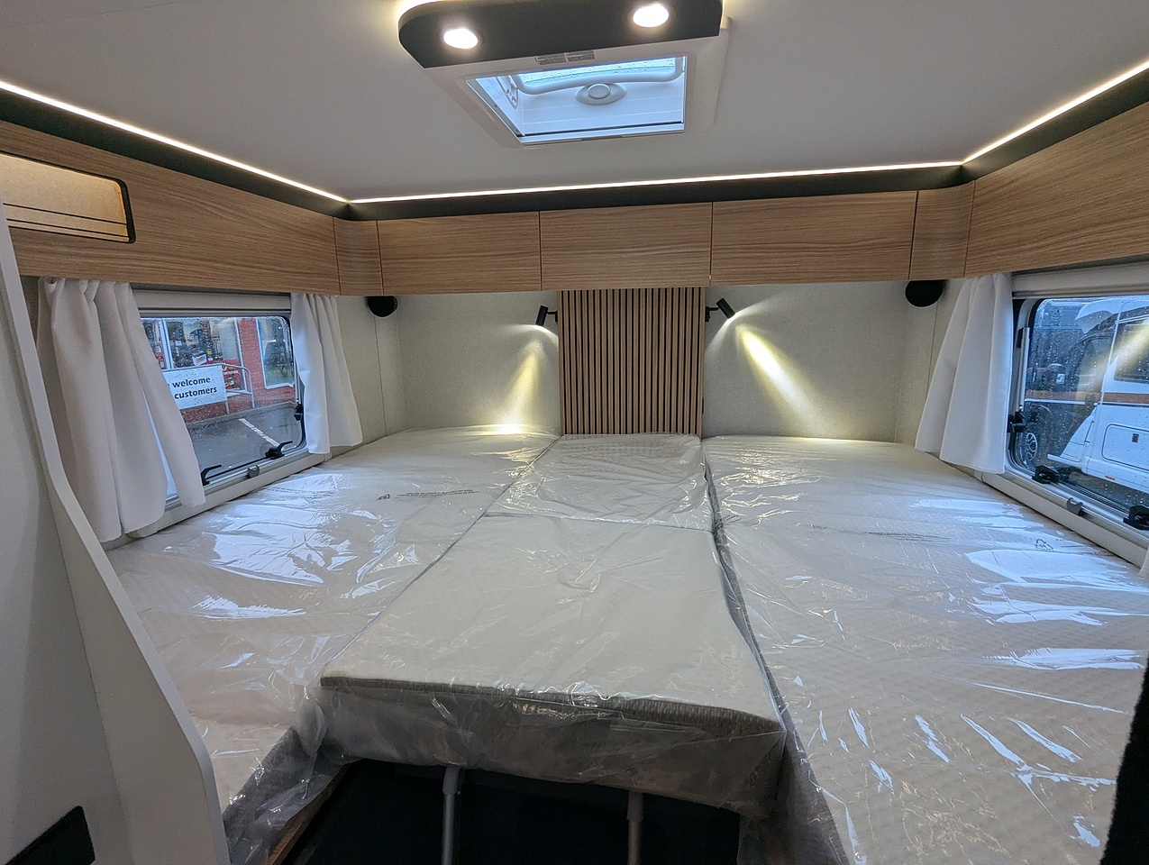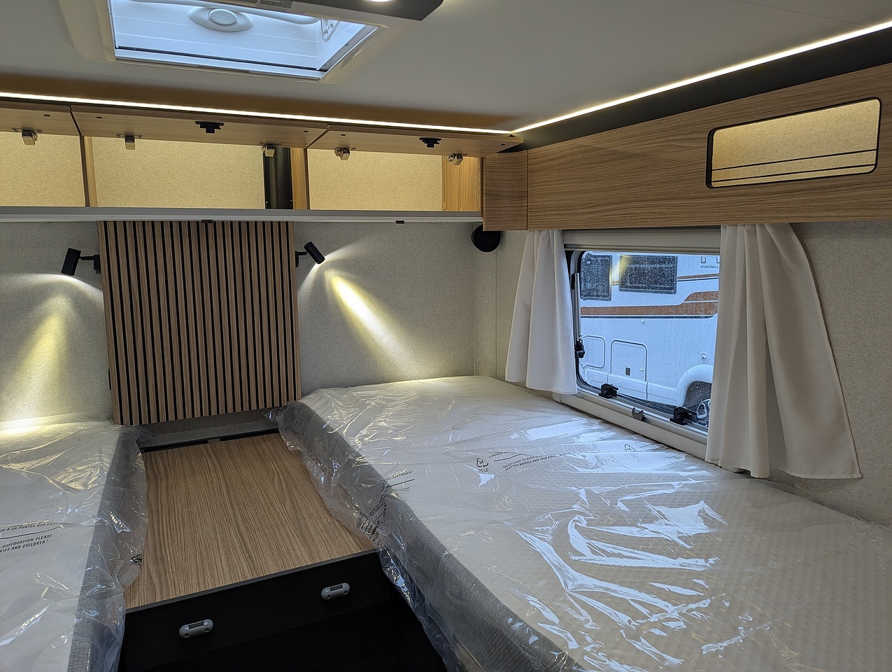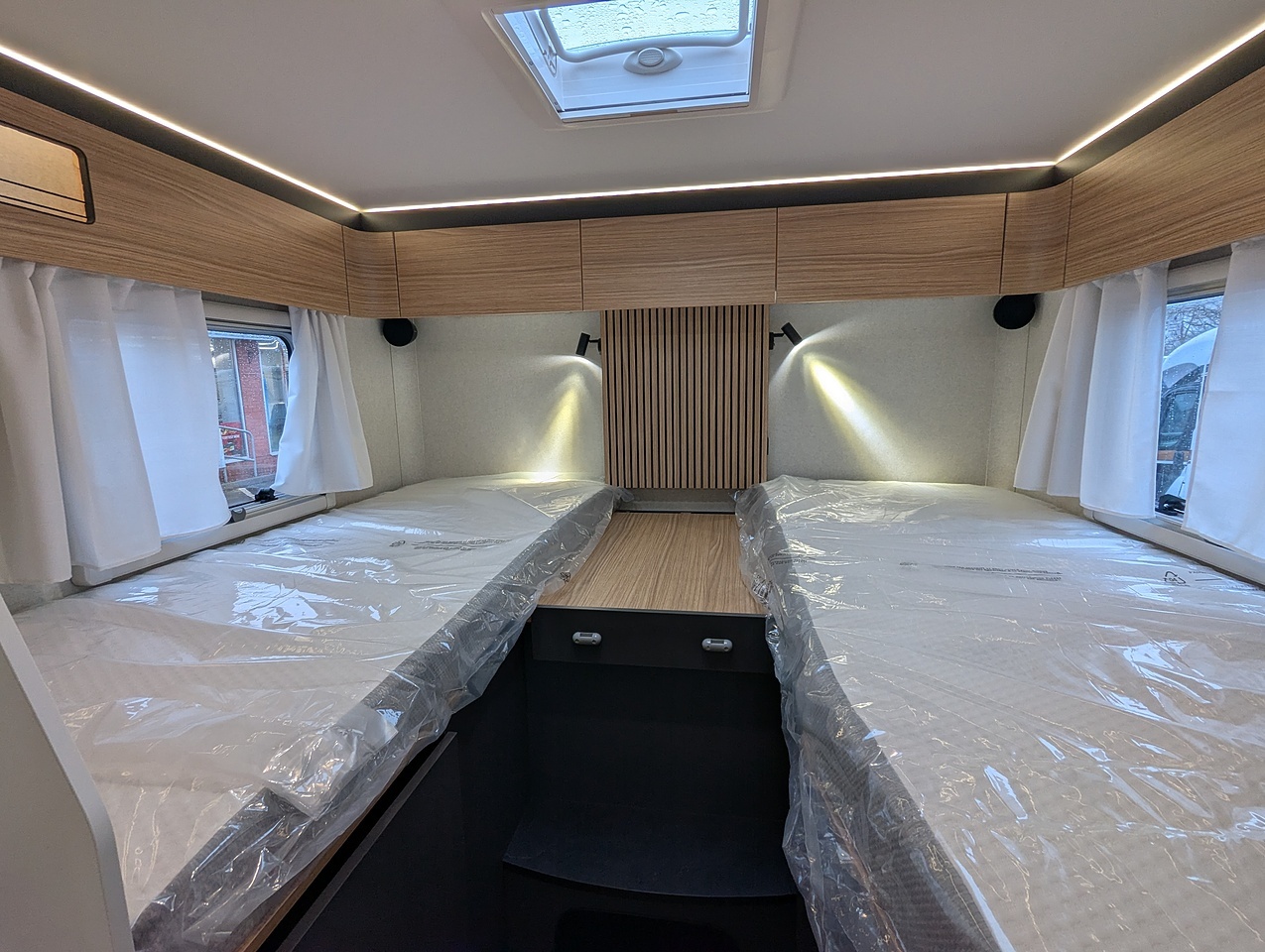 The sleeping area at the rear of the vehicle is separated from the rest of the cabin by a door. It has two single twin beds with comfortable mattresses on slatted bases. The bed extension between the 2 beds allows you to relax in an XXL bed. You also have plenty of generous storage space, with large wardrobes and numerous interior cupboards.