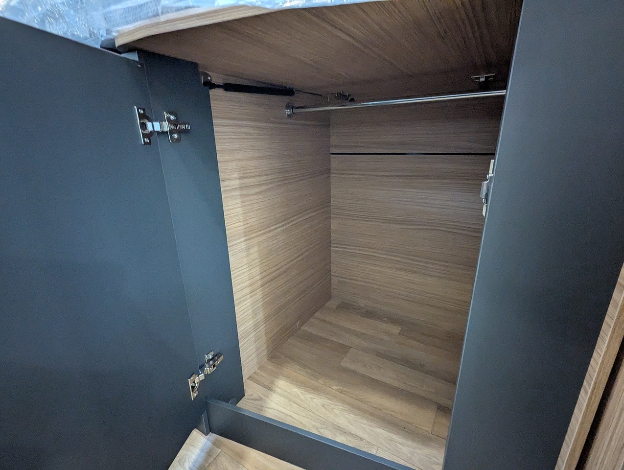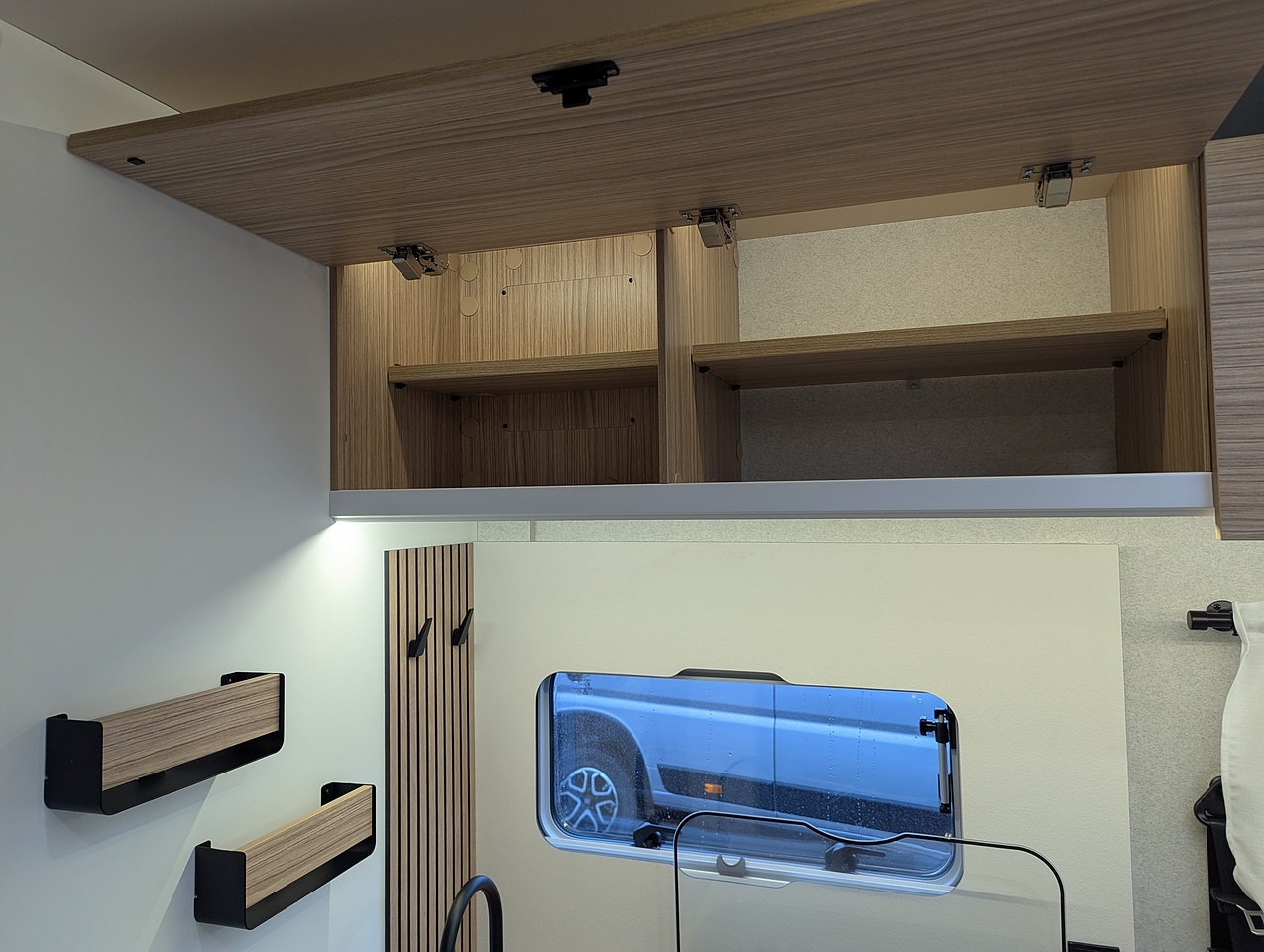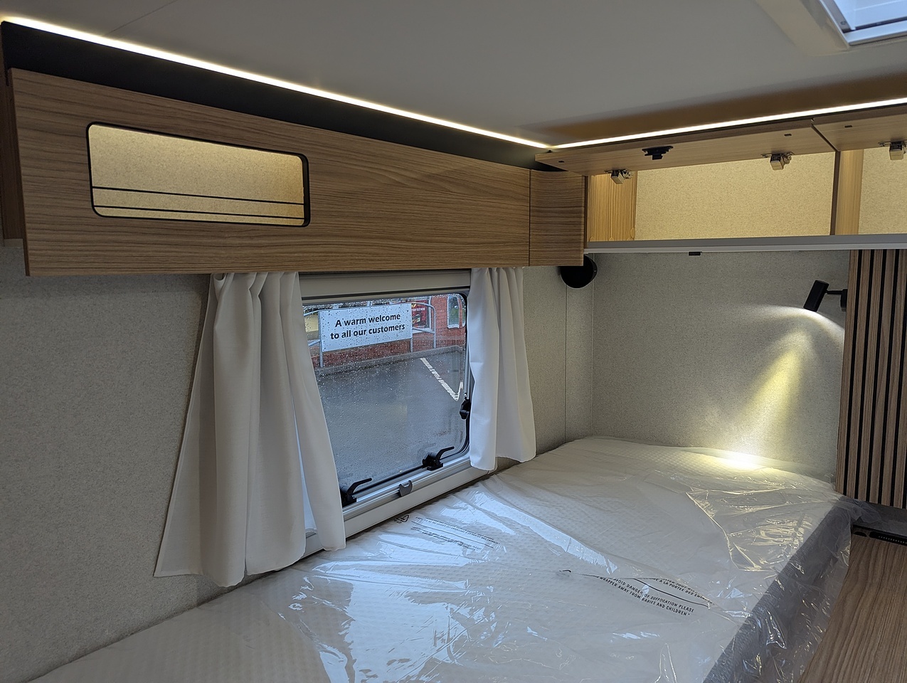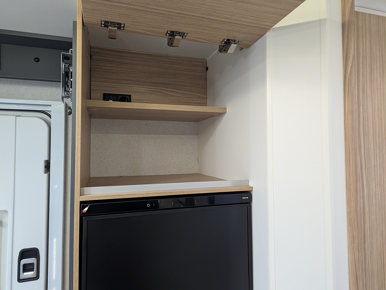 The sleeping area at the rear of the vehicle is separated from the rest of the cabin by a door. It has two single twin beds with comfortable mattresses on slatted bases. The bed extension between the 2 beds allows you to relax in an XXL bed. You also have plenty of generous storage space, with large wardrobes and numerous interior cupboards.