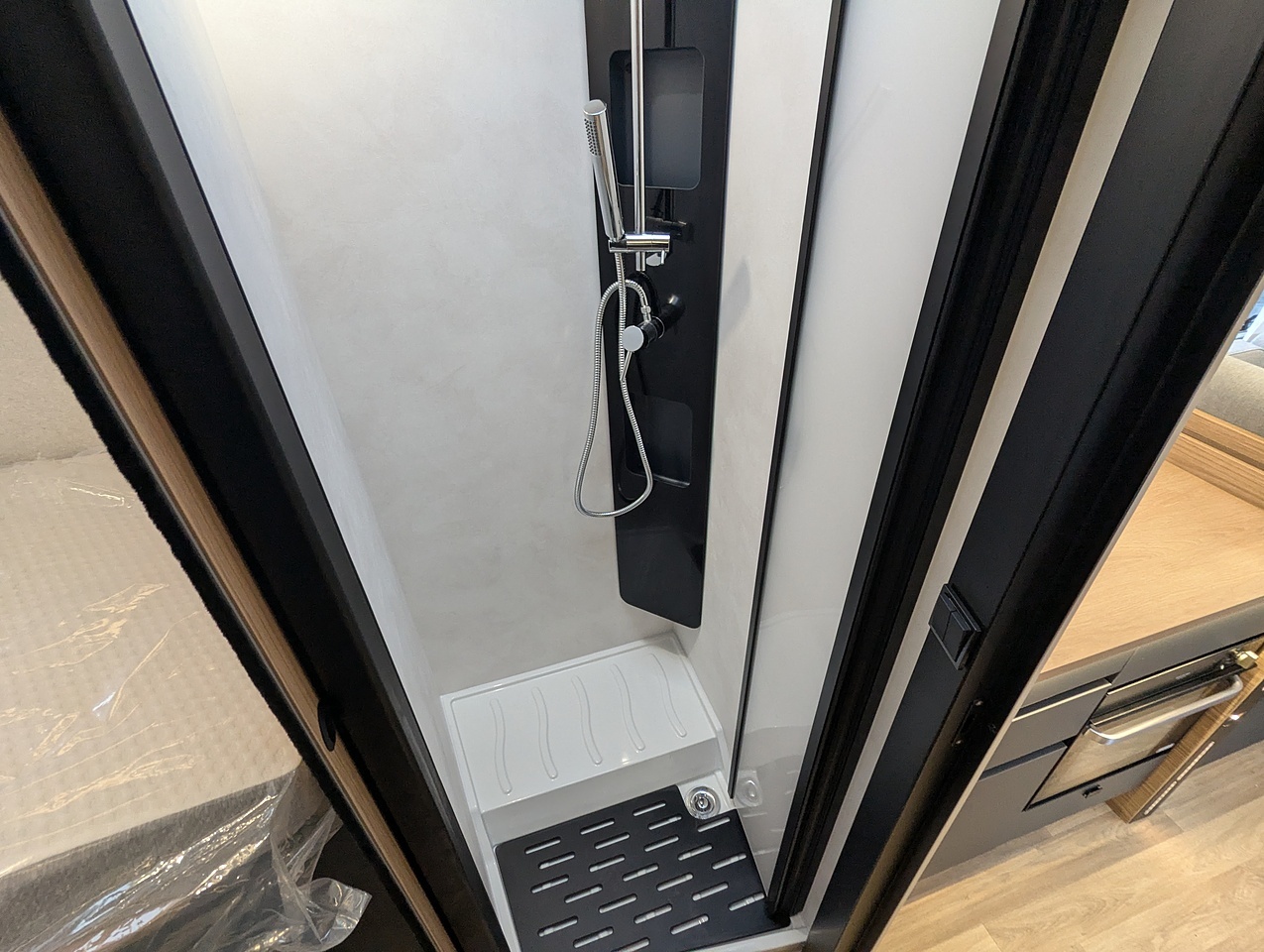 The shower room is walk-through and has double partitioning to provide 3 independent living areas. The skylight provides light and ventilation. And because it's always practical, the shower room is equipped with a clothes hook and towel rail.