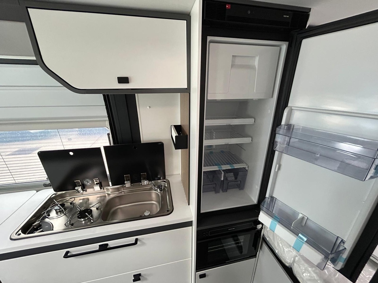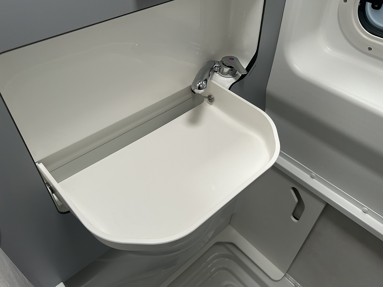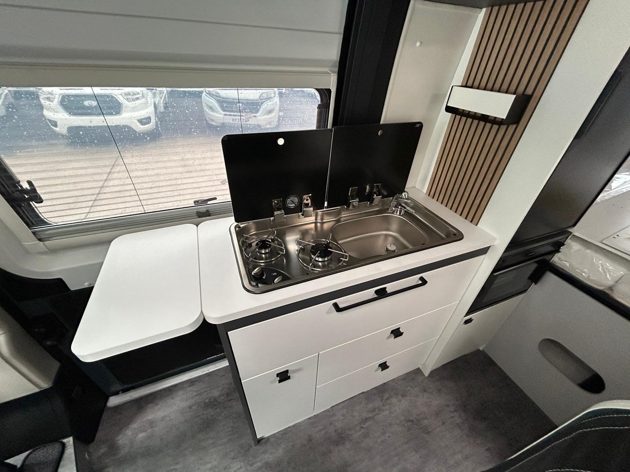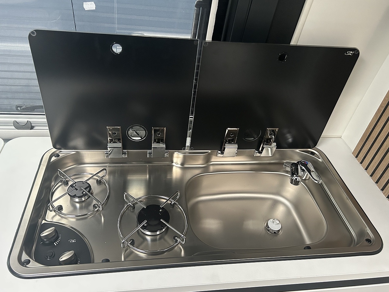 The V600G's galley is designed to allow you to cook with ease. It is equipped with 5 drawers with end-of-travel brakes and an overhead cabinet. The hob has a 2-burner piezo ignition system, and a sink cover extends the work surface, as does the extension at the end of the cabinet.