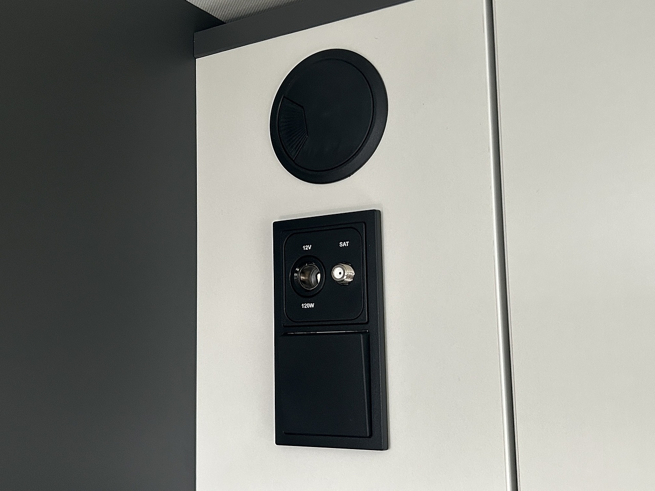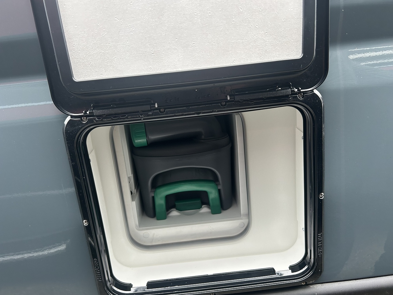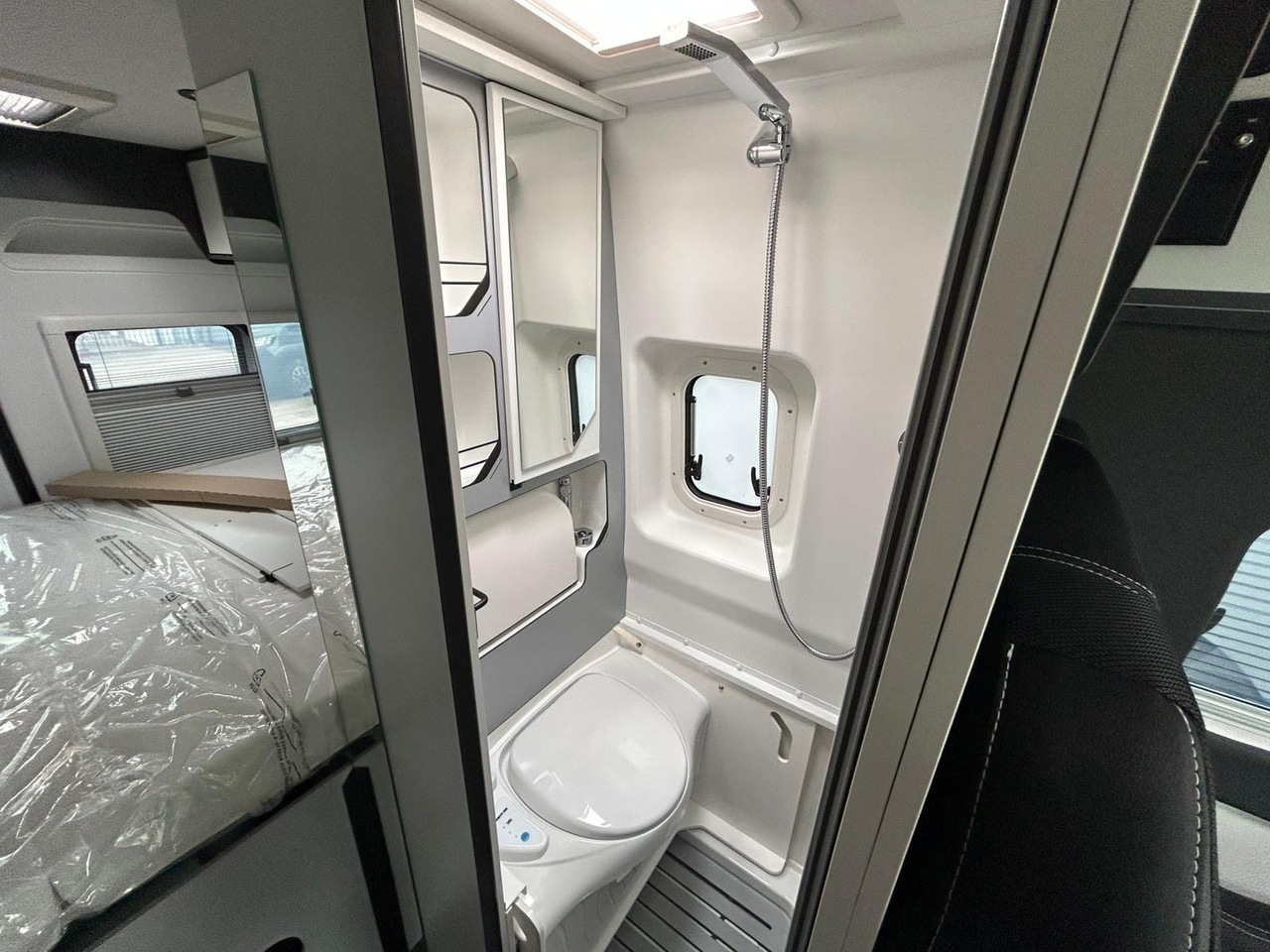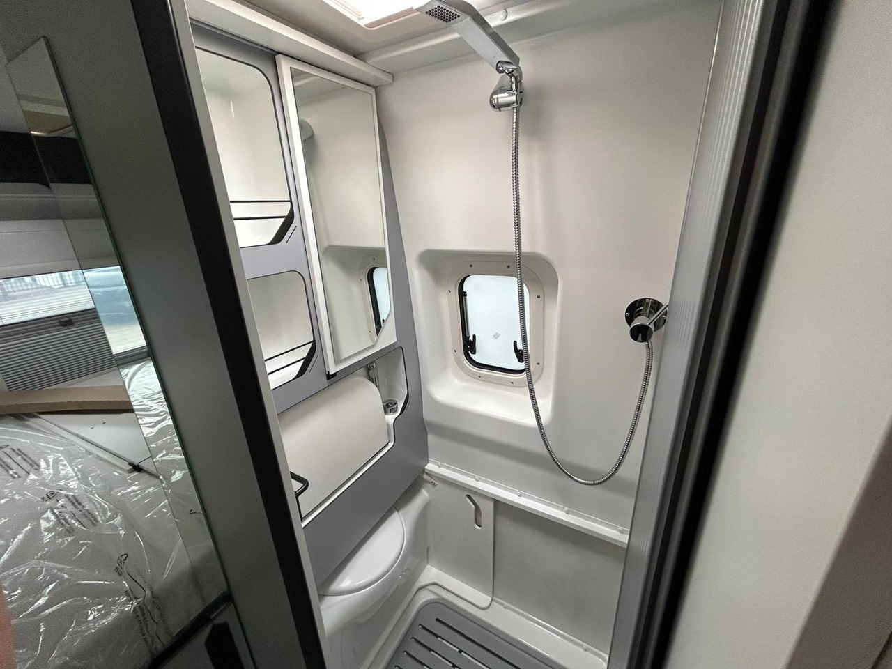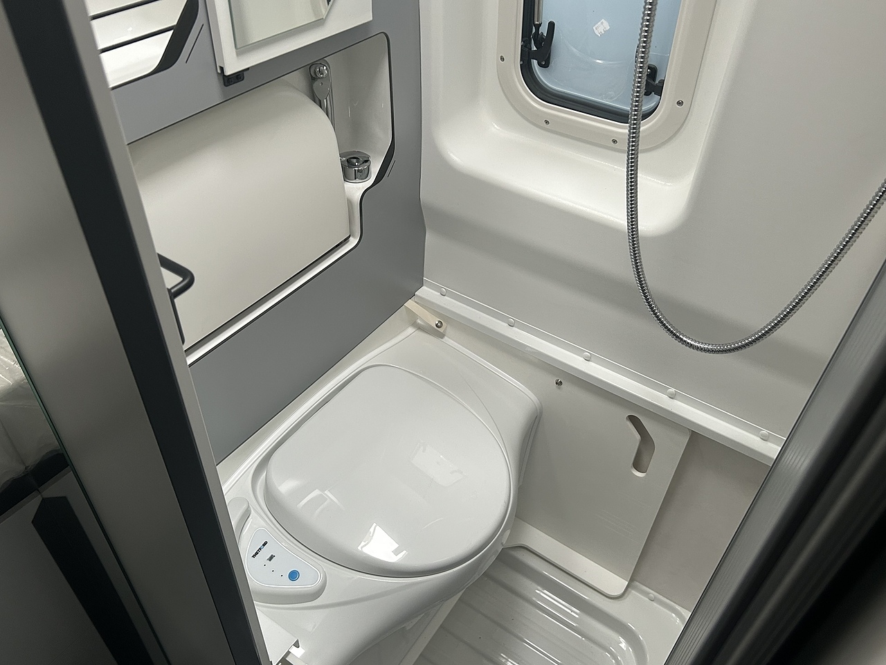 The V600G is equipped with a 3in1 shower room featuring clever solutions for comfortable use. This 790×860 cm space is fitted with a slide-mounted Thetford toilet and a retractable washbasin, leaving a large shower area. A 280×280 skylight provides good ventilation.