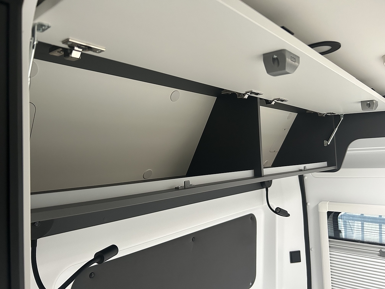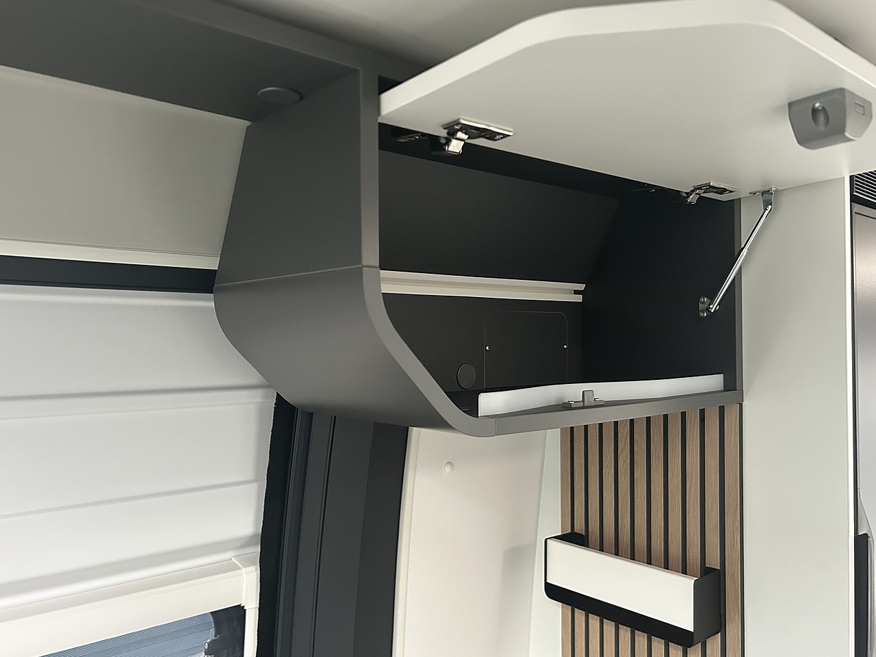 The V600G has a garage bed with a comfort mattress and slatted base. The bed measures 135 x 194 cm. Numerous overhead cupboards on either side of the bed conceal USB ports. Under the bed, there's a large storage compartment for all your essentials and easy access to the gas compartment and fresh water tank.