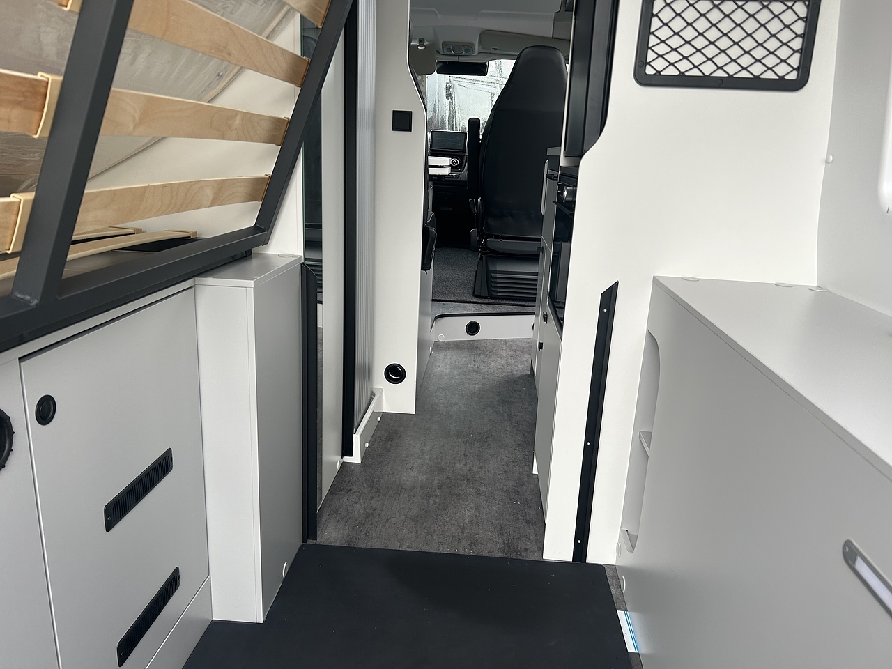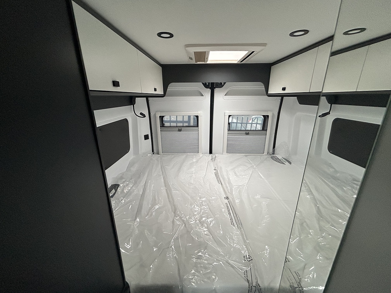 The converted van Pilote V600G offers a functional kitchen with five compartmentalized drawers and an integrated garbage bin, allowing for organized and convenient storage. Its large living area comfortably accommodates up to four people, providing a friendly space to relax and socialize. Additionally, the shower space is spacious, offering comfort and convenience for daily hygiene. The van also features a practical wardrobe for clothing storage. Lastly, the garage bed is equipped with a comfortable mattress and a slatted base, ensuring restful sleep for a good night's rest.