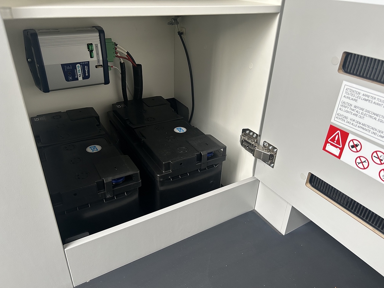 The storage area of the Pilote V600G is built under a transverse garage bed, offering a spacious, accessible, and flexible compartment. This generous volume allows for easy storage of bulky equipment while maintaining convenient access to the gas compartment and fresh water tank. This layout maximizes the available space to meet all your storage needs while traveling.
