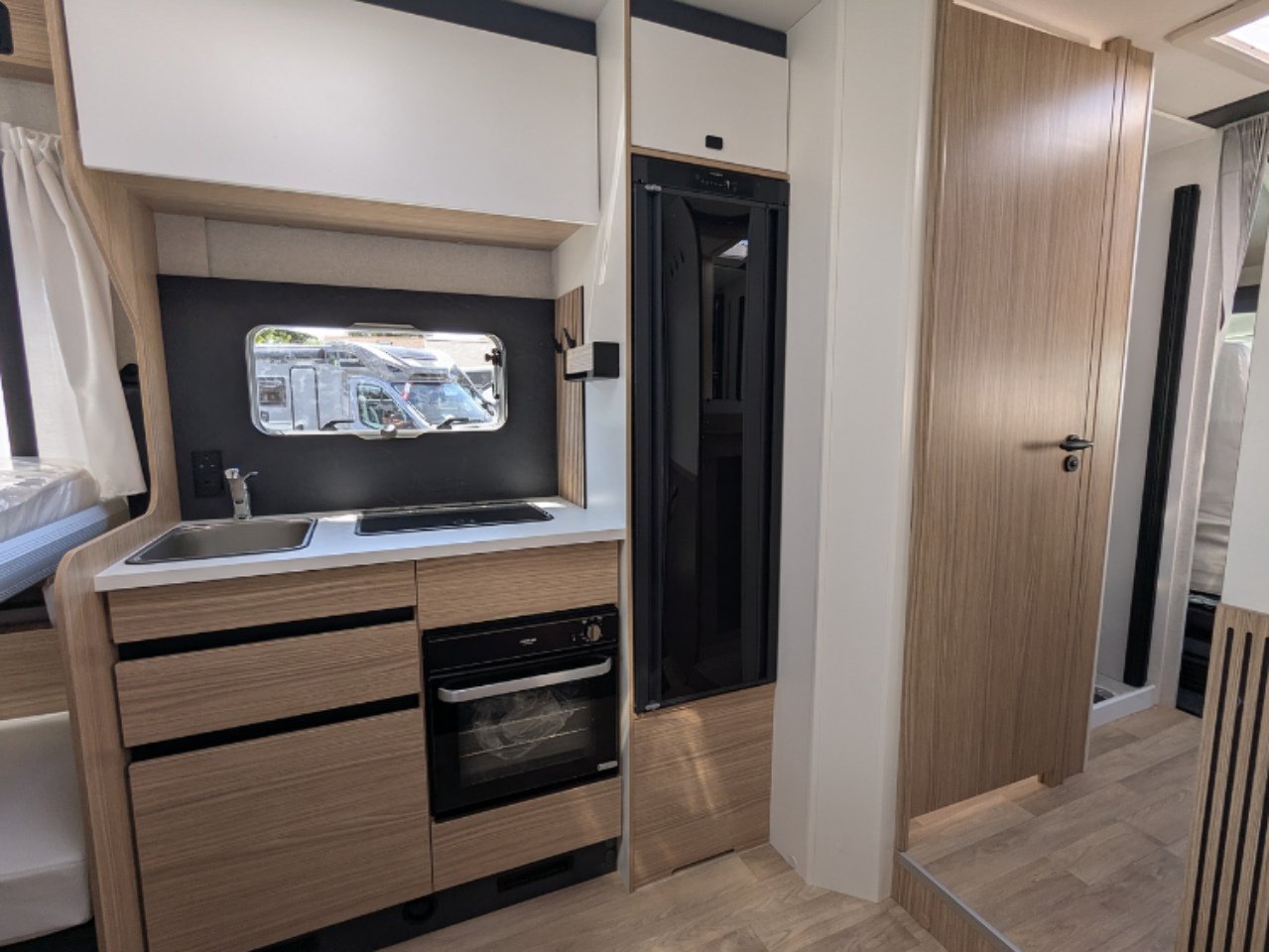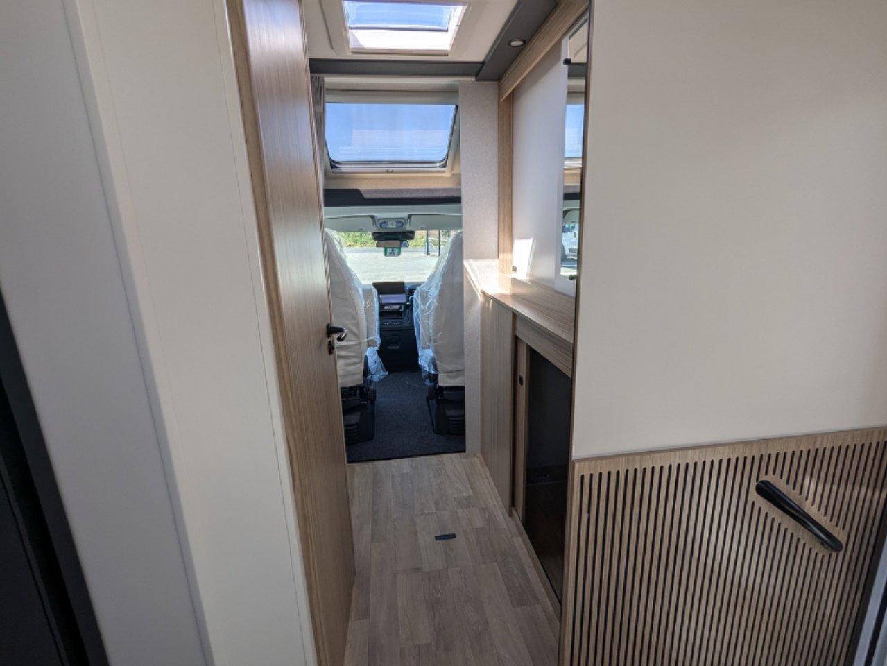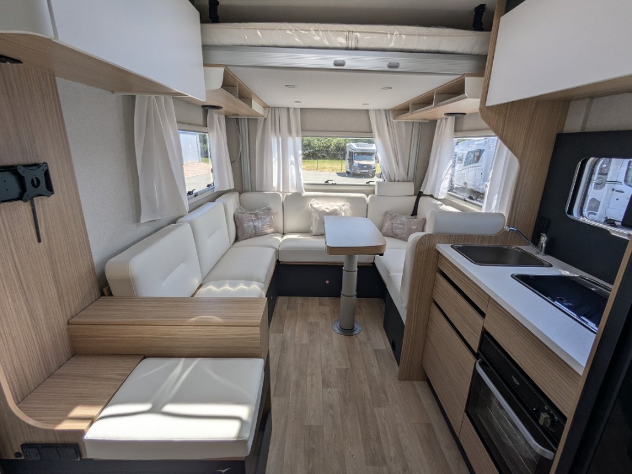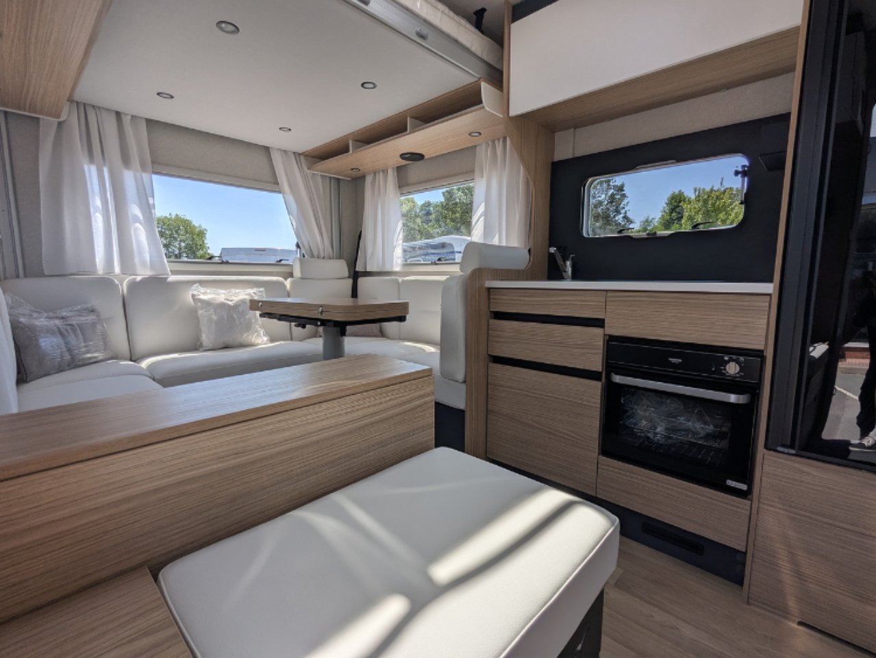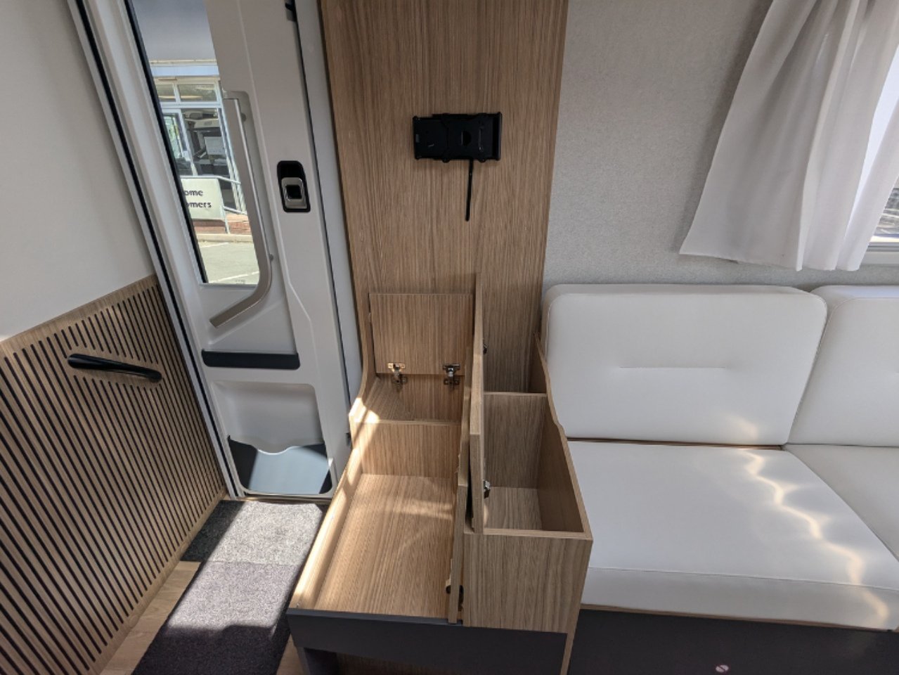 The sleeping area consists of a large XXL drop-down bed 160x200cm. Well thought out, the placement of the TV arm allows you to watch it from the comfort of your bed. A bed in the living room can accommodate 2 additional traveller’s since the P696U is also equipped for 4 vehicle registration seats.