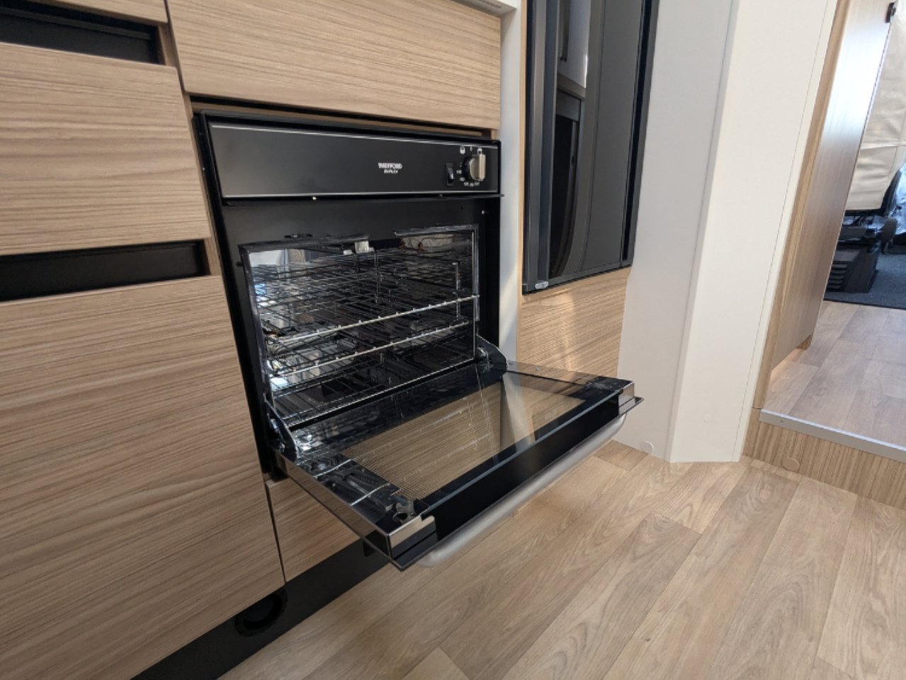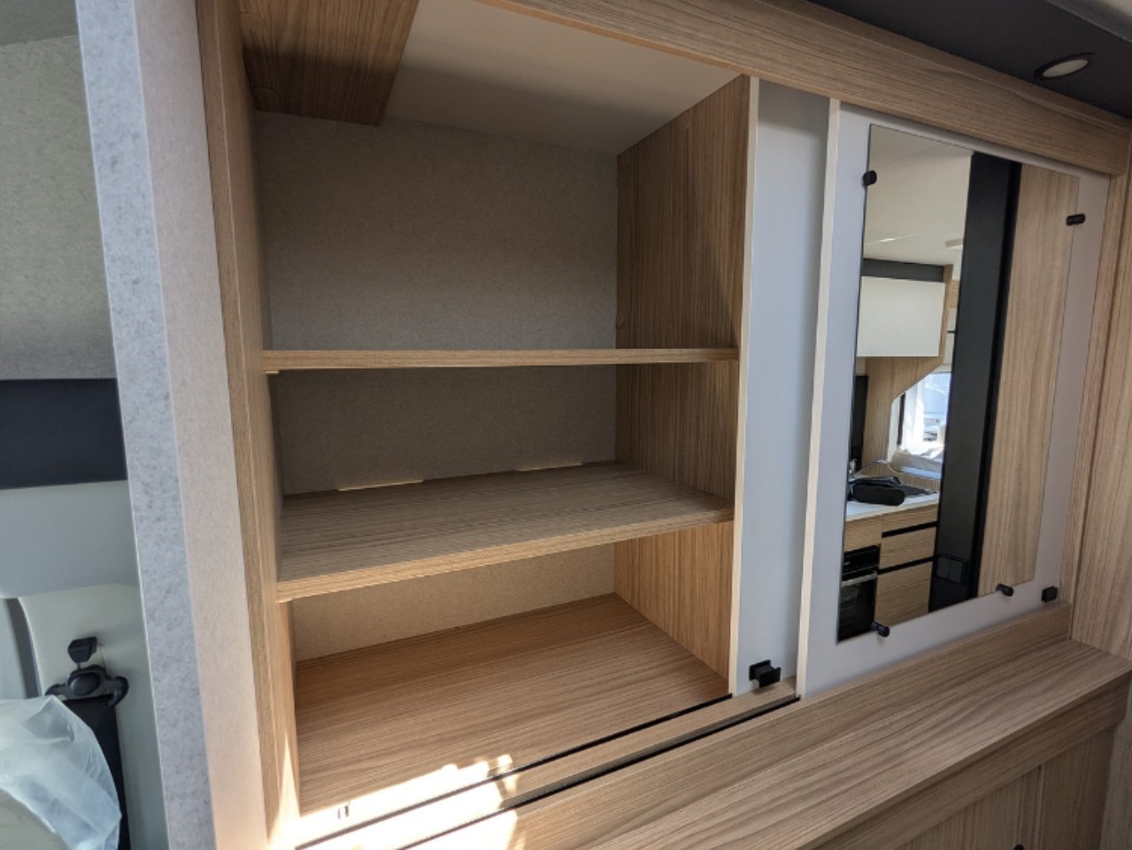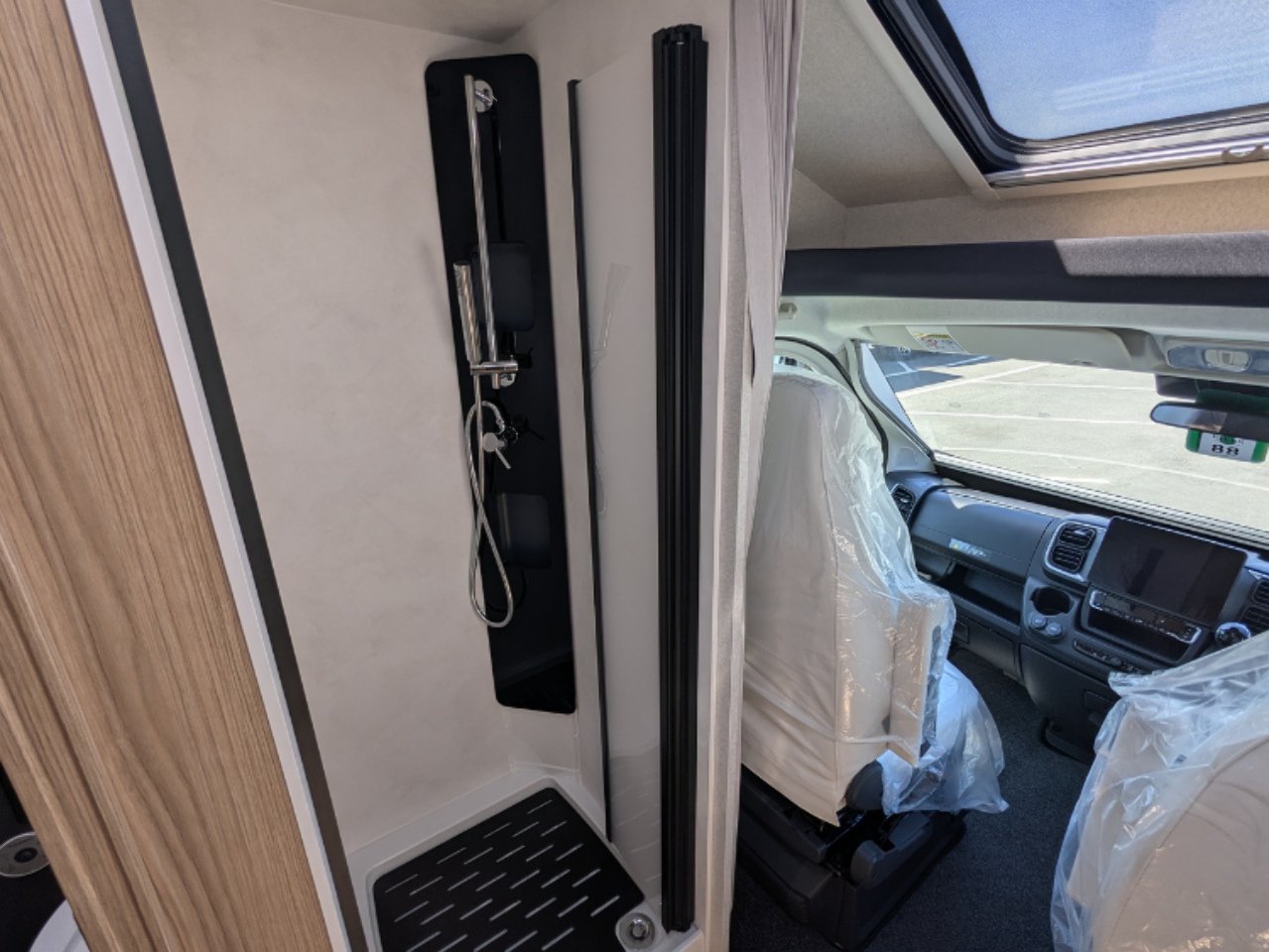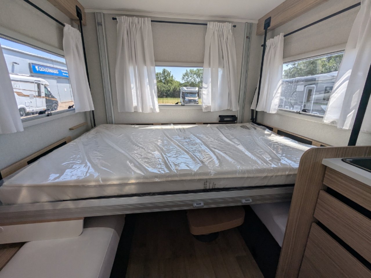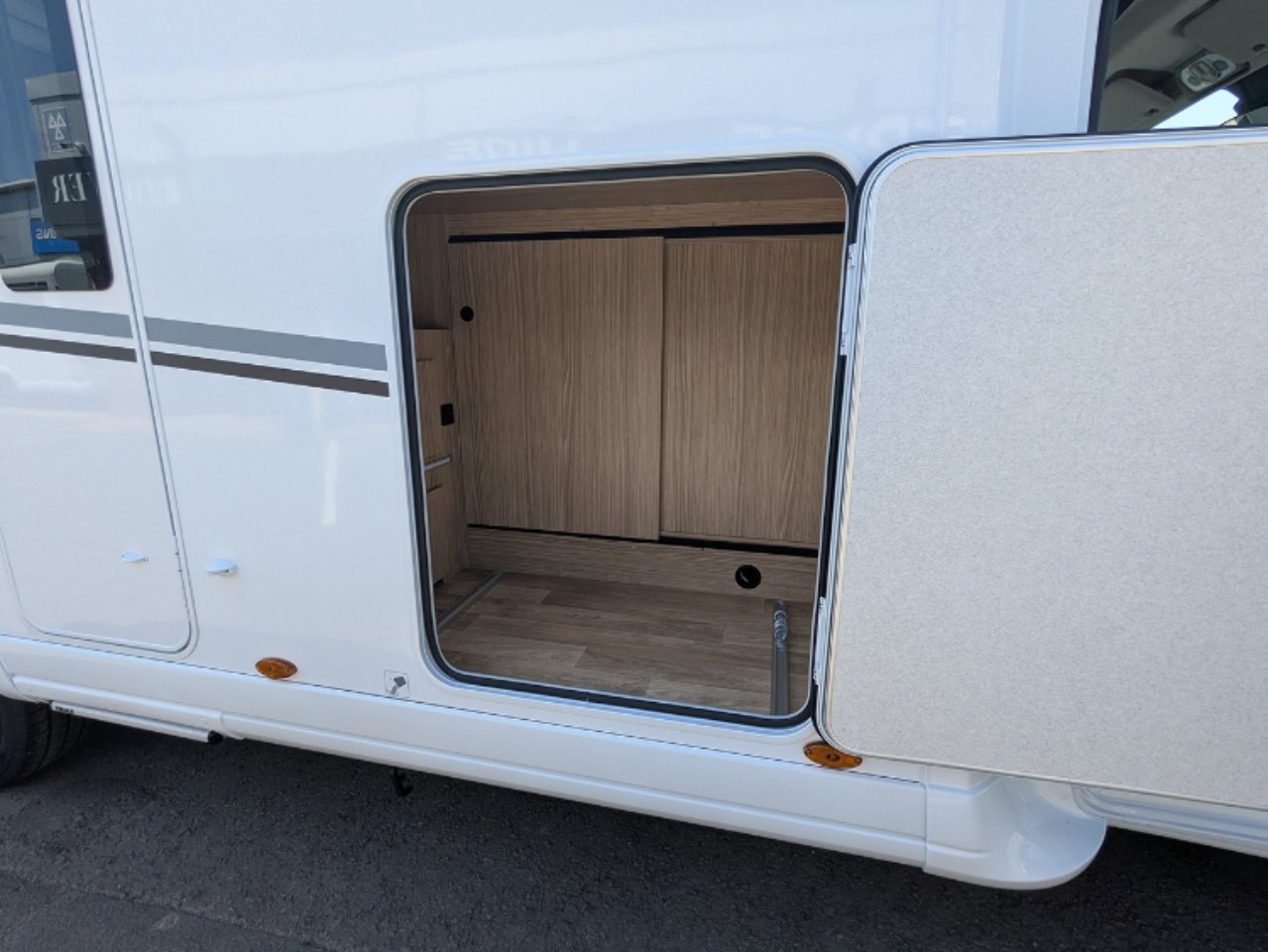 The sleeping area consists of a large XXL drop-down bed 160x200cm. Well thought out, the placement of the TV arm allows you to watch it from the comfort of your bed. A bed in the living room can accommodate 2 additional traveller’s since the P696U is also equipped for 4 vehicle registration seats.